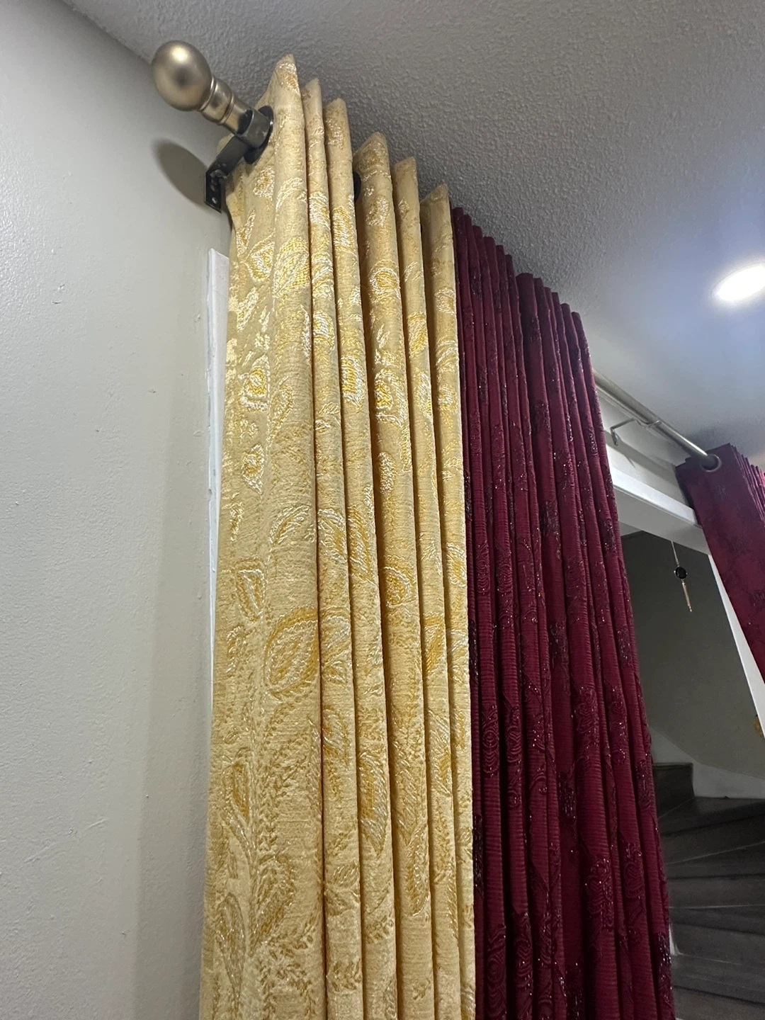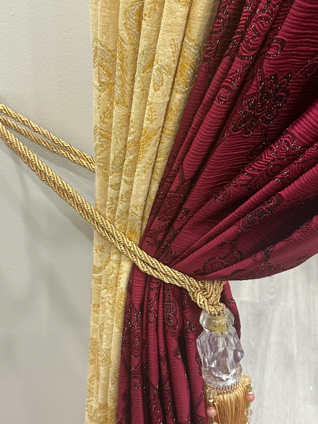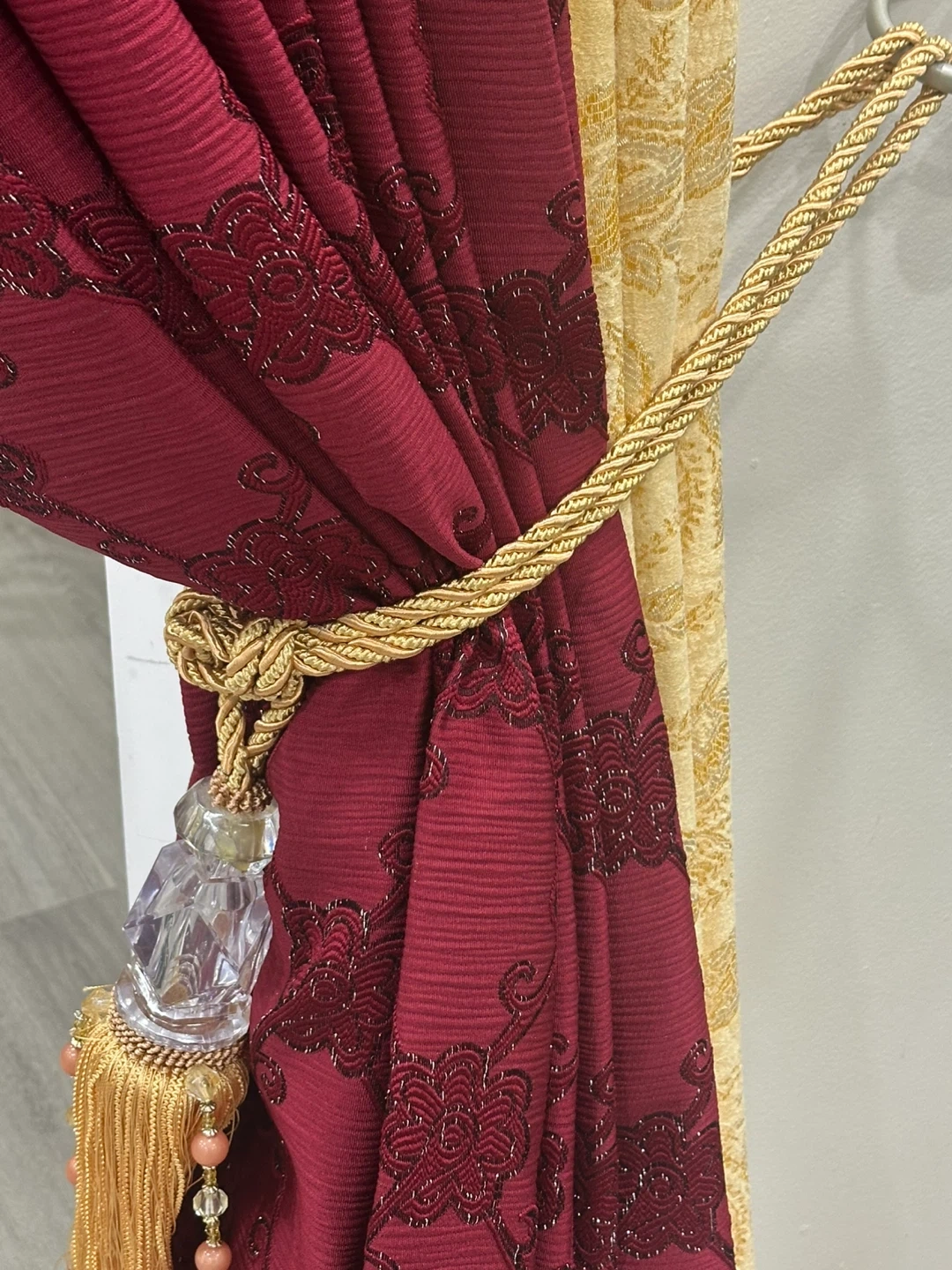 16Beautiful set of decorative curtains in burgundy and gold. They add a touch of elegance to any room. Comes with tie backs!