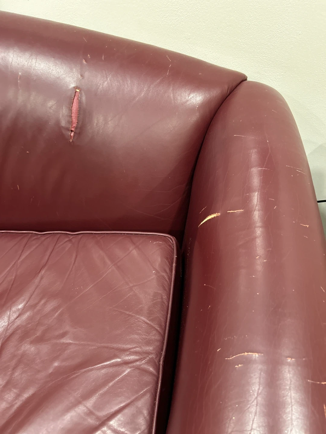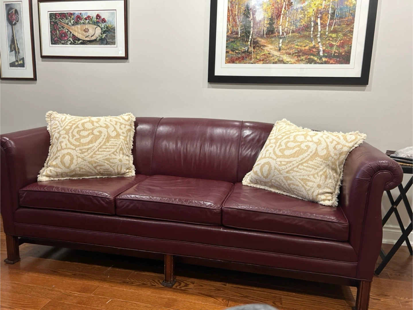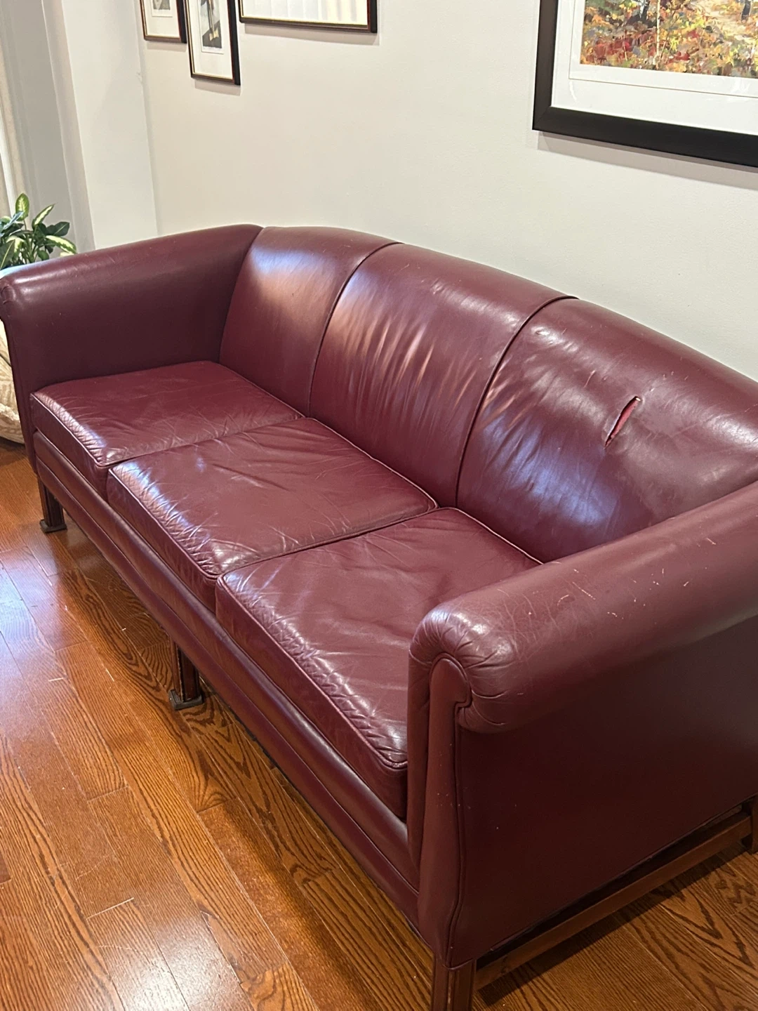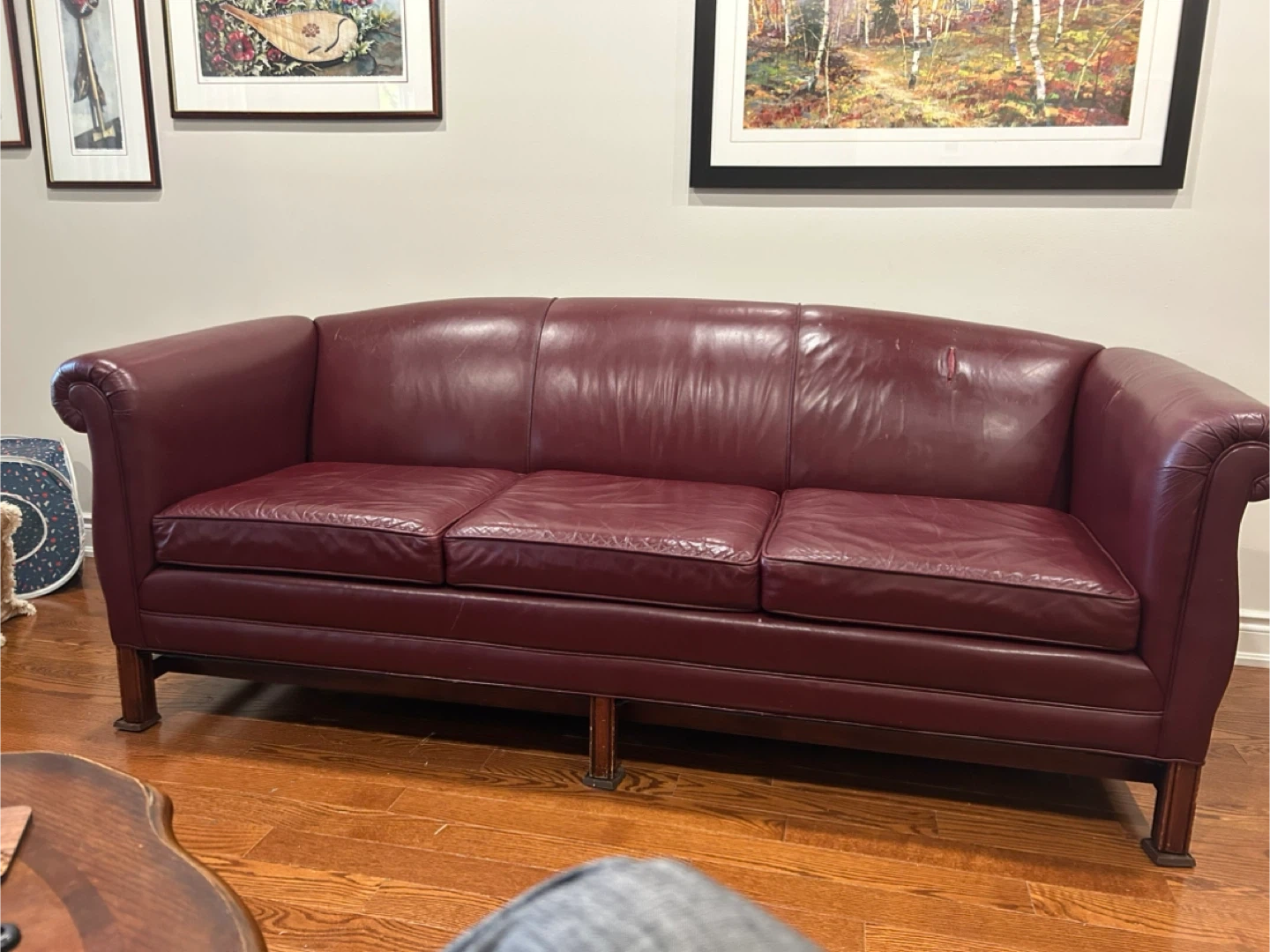 Selling a burgundy leather three-seat sofa. It's a beautiful piece that would look great in any living room! There are 2 tears that can be fixed. Makes a great sofa for basement. 78 inches long, vintage. Made at fine furniture store Morettes, in Hillsburg.
