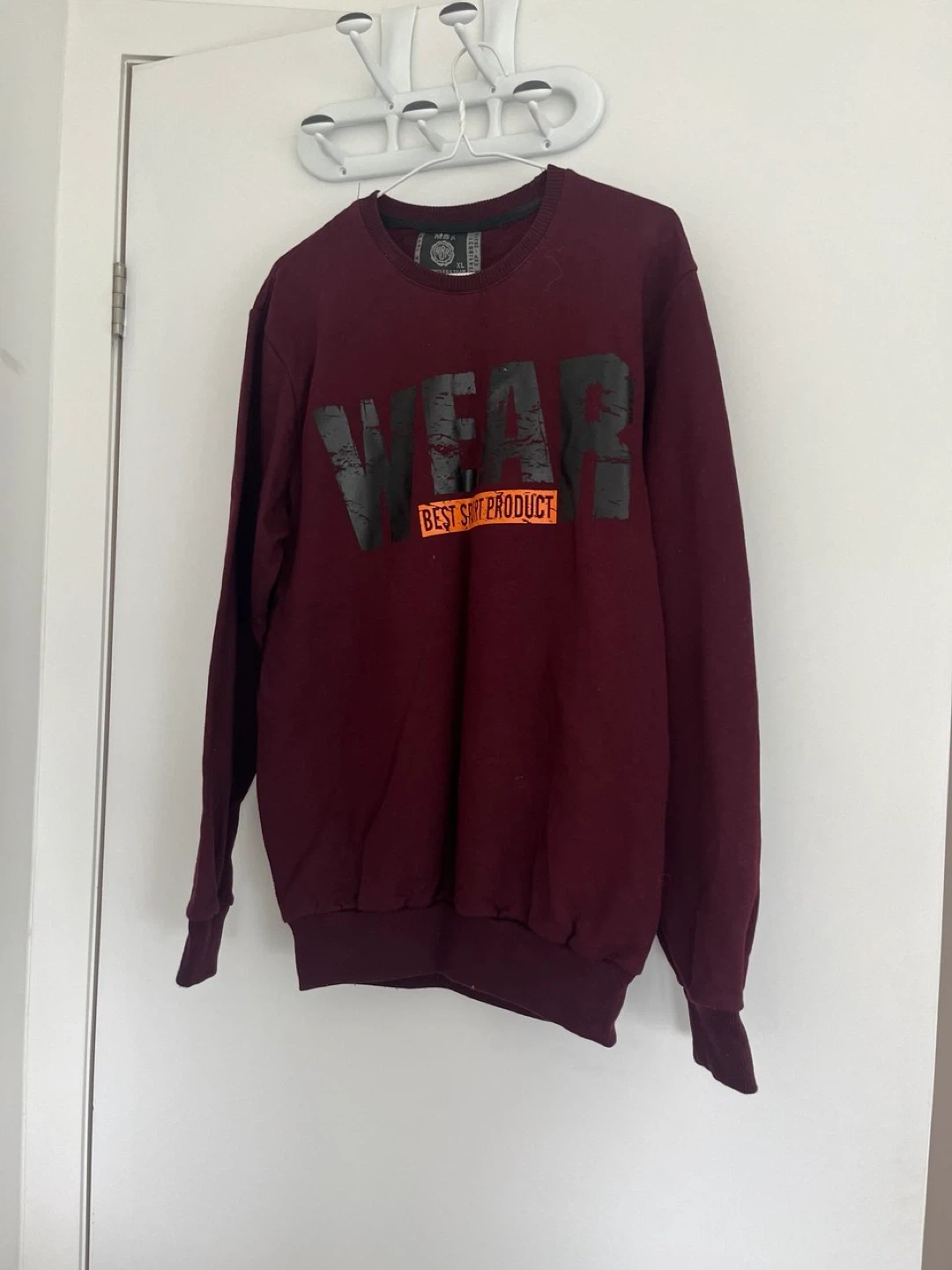 10Selling a burgundy sweatshirt with the text 'WEAR BEST SHIT PRODUCT' printed on the front. It's in great condition and is a size XL