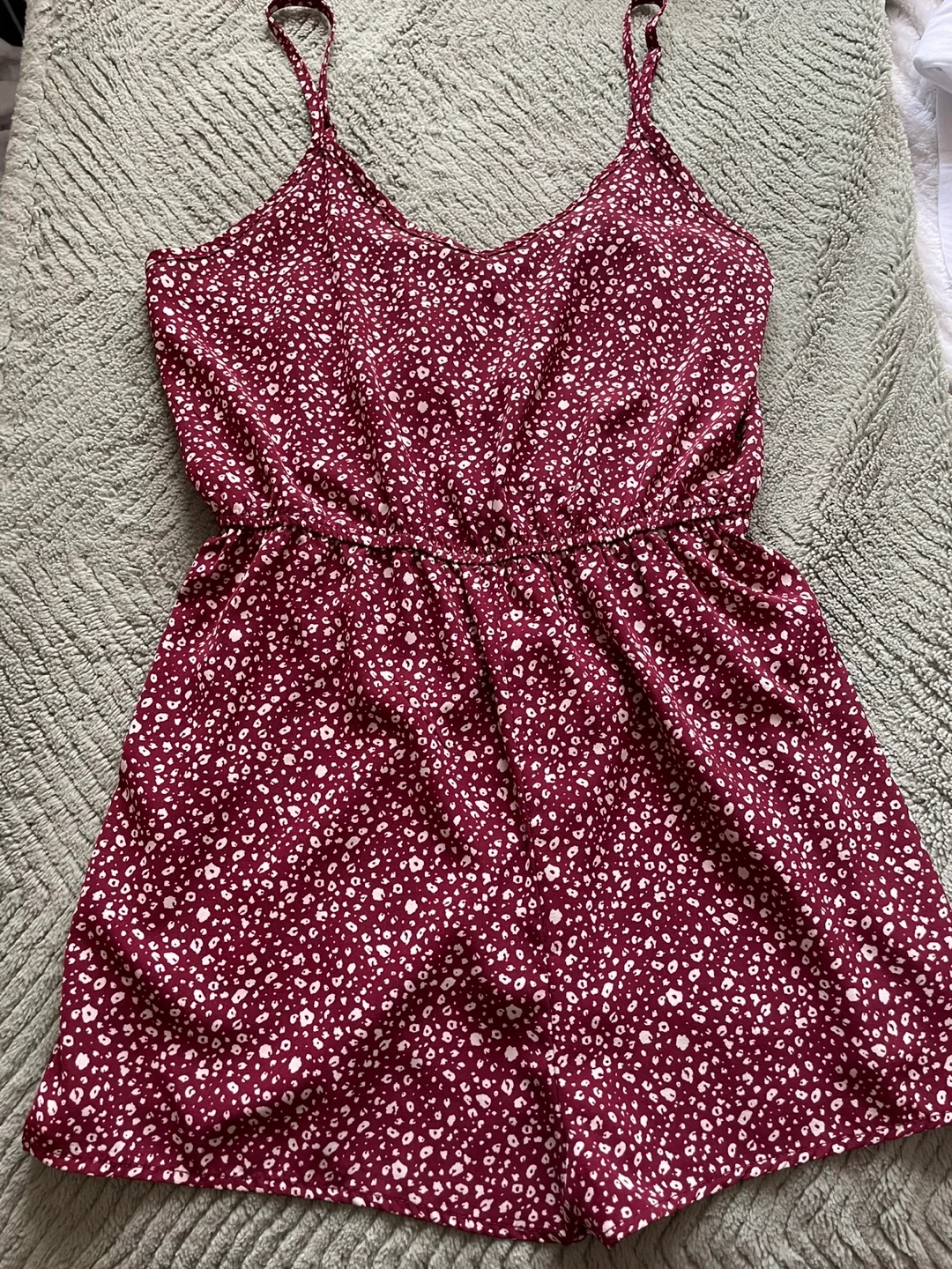 A cute romper with a burgundy background and a white floral print. It has spaghetti straps and an elastic waist. Perfect for summer! Pick-up ONLY