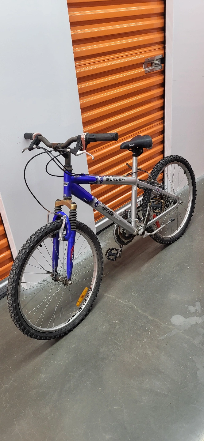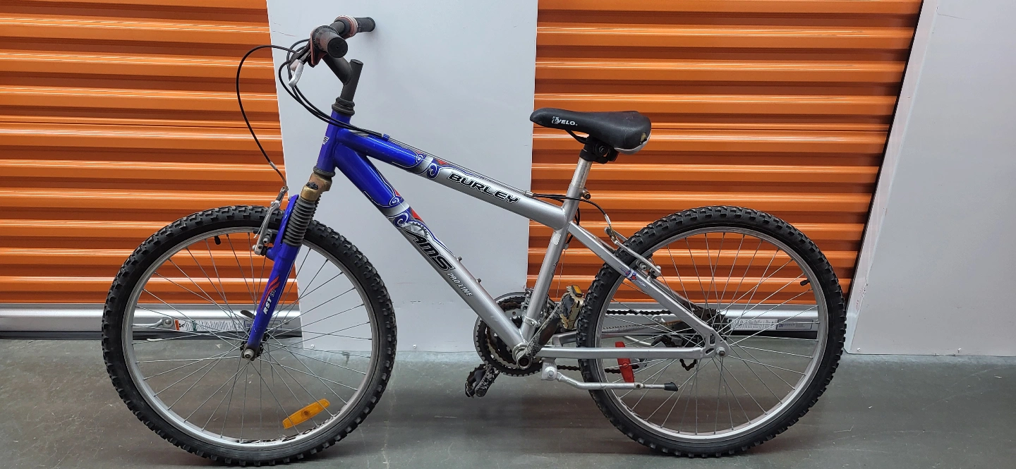 52Used Burley bike. 24-inch wheels. Silver and blue frame. Front suspension forks. Wheels need air and the gears need WD40, perfect summer project.