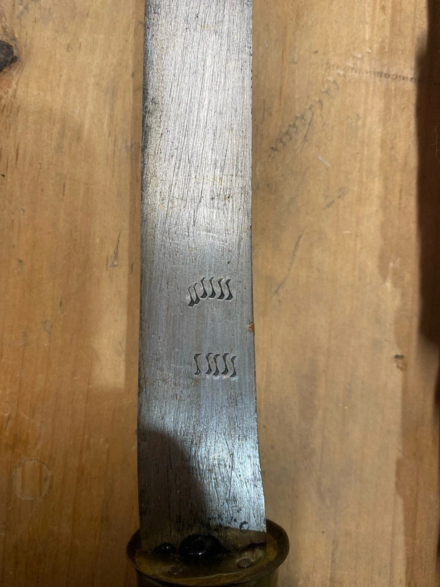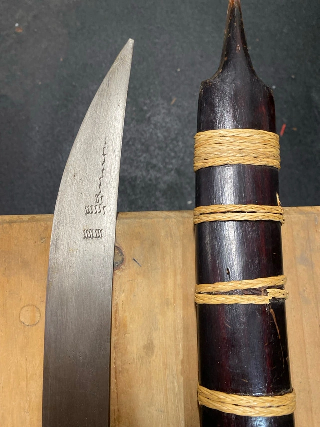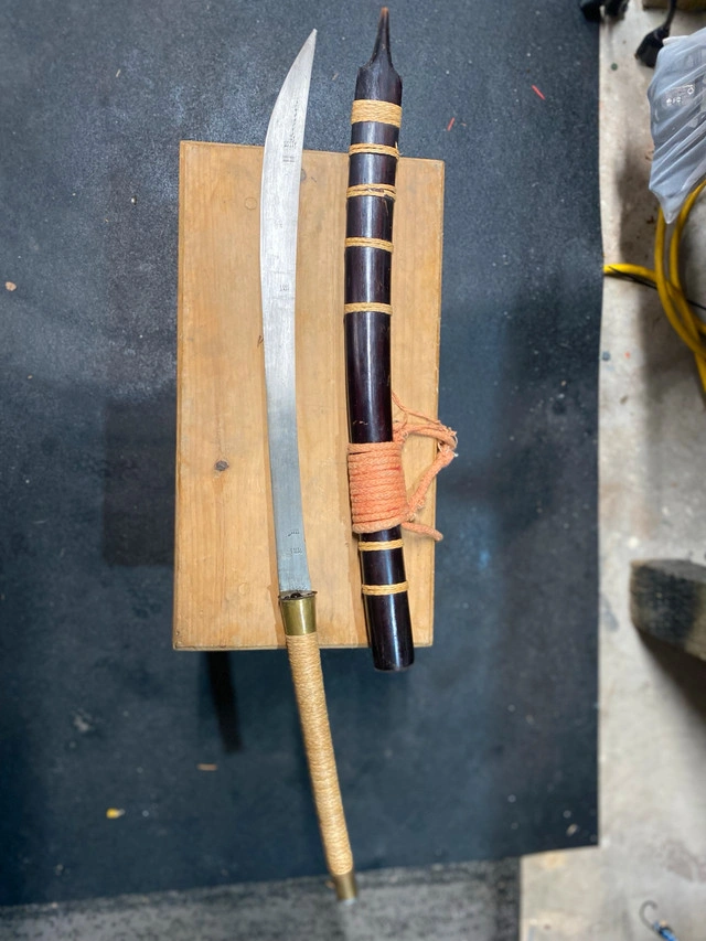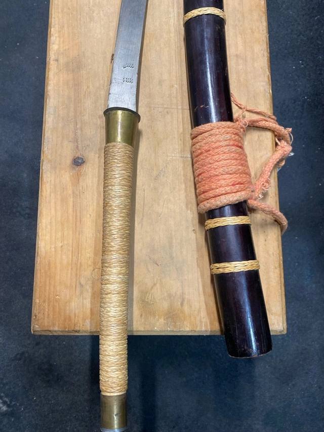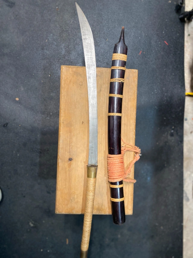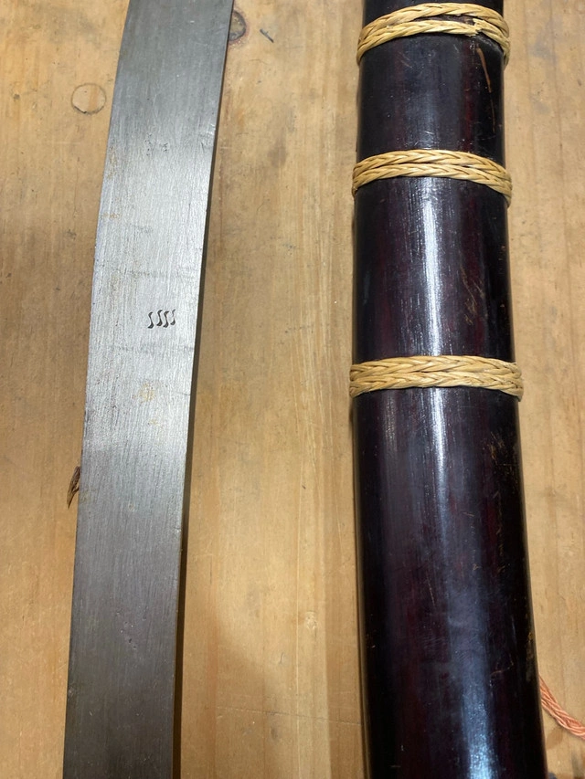 The image shows a Burmese Dha sword with a wooden scabbard. Here is some helpful information: The Dha is a general term for knives and swords used across Southeast Asia, especially in Myanmar, Thailand, and surrounding regions. It functions as both a tool and a weapon. The scabbard is often made of wood and may feature decorative elements. Dhas vary in size and shape, reflecting the diverse cultures that use them. Collectors value authentic Dhas, looking for quality craftsmanship and signs of age. The Dha is still used today as a machete and weapon lots of unique markings on the sword 34”