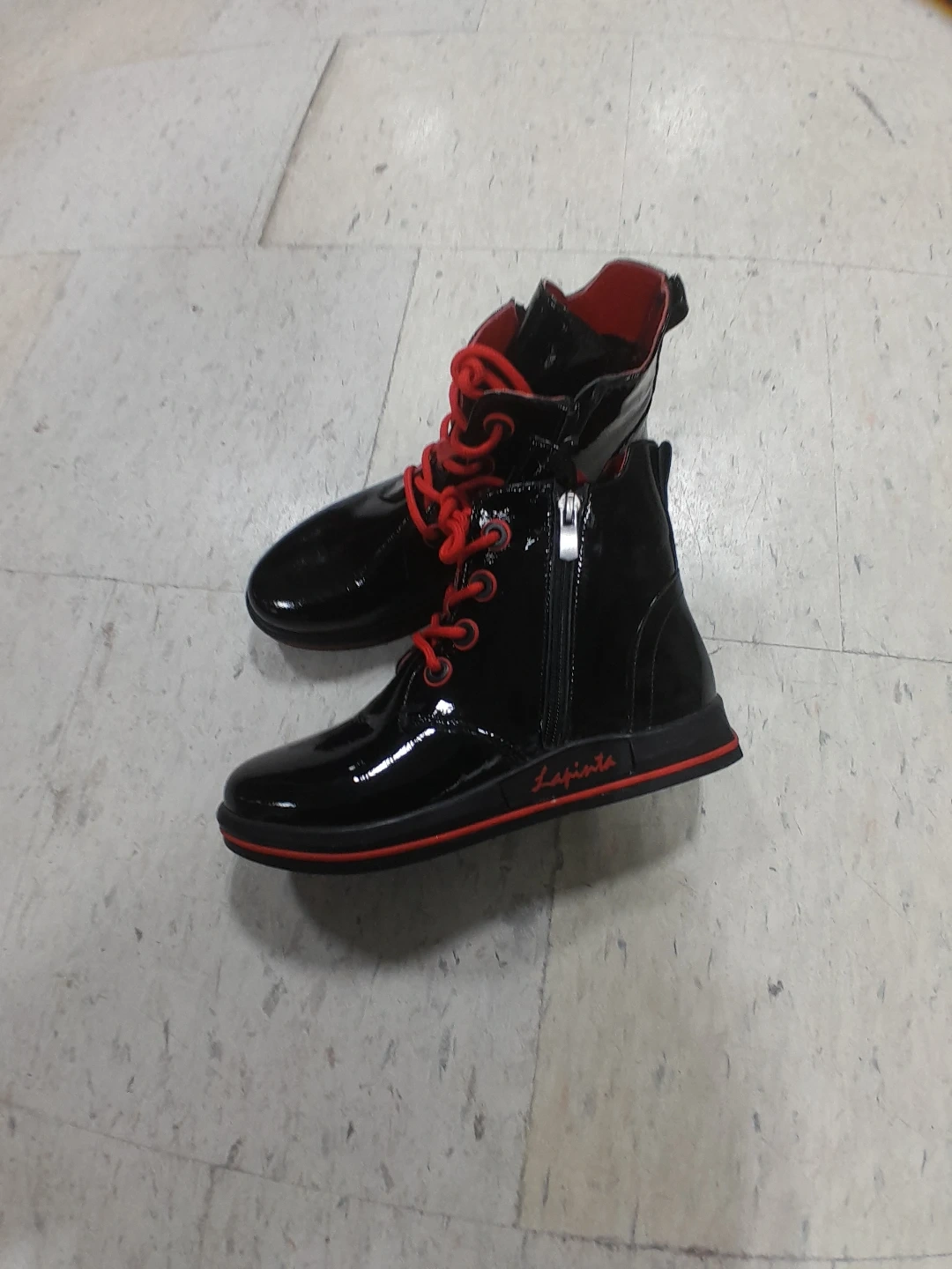Stylish black patent boots with bold red laces and lining. These ankle boots feature a side zipper for easy wear. They have a sleek, shiny finish perfect for adding flair to any outfit original La Pinta women's Size 6.5