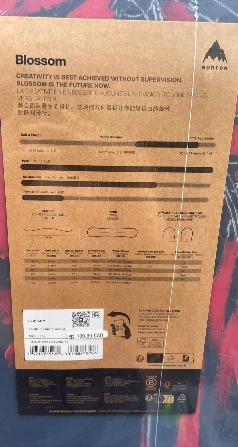 Burton Blossom snowboard. Board Size: 144 Waist Width: 239.5mm Fits Women's Binding Size: M OR Men’s Binding Size: S Retail value: $739.99 Our son won it at a contest but is unable to ride this brand. Pick up in North Van close to Iron Worker’s Bridge.