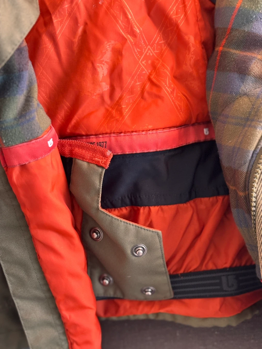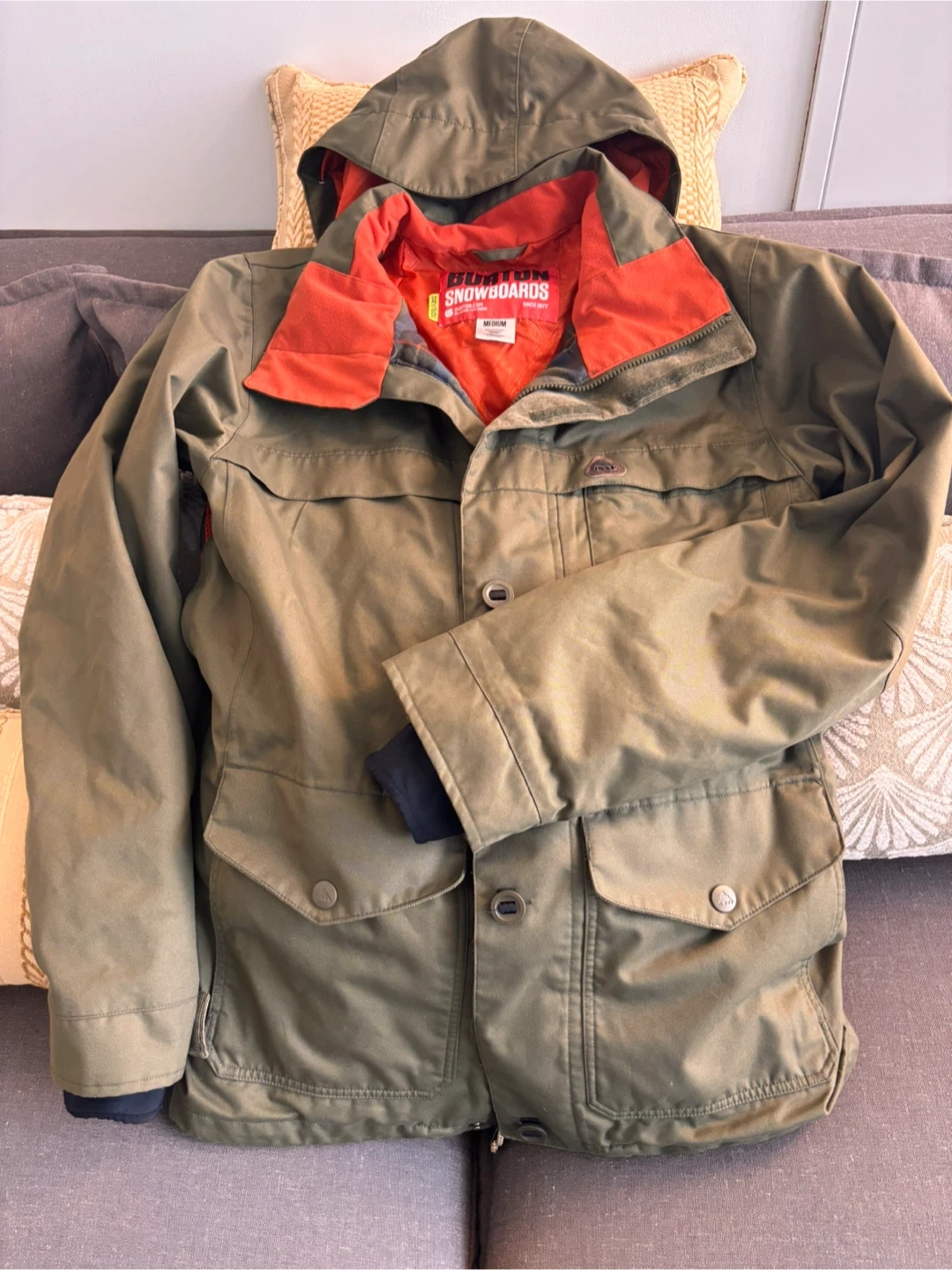 60Selling a Burton Snowboards jacket in size medium. It's a great jacket for snowboarding or other winter activities. The jacket features a hood and several pockets for storage. The colors are a mix of olive green and orange. It's in good condition and ready for a new owner!