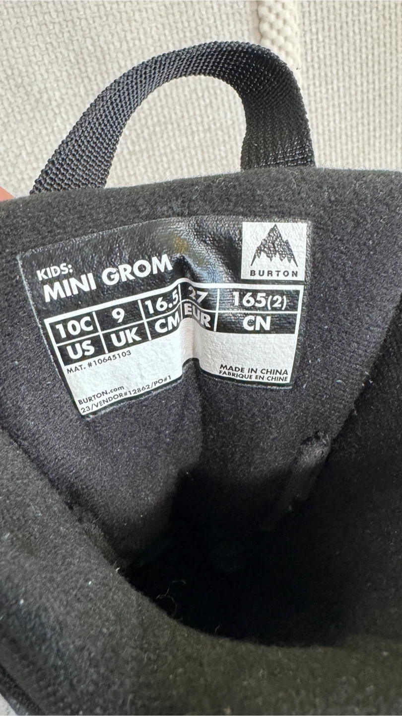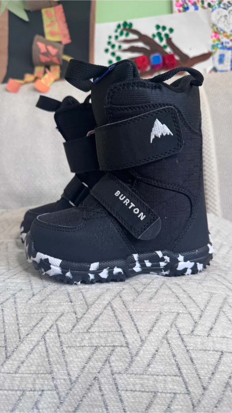 These Burton toddler's snowboard boots are in great condition and ready for the slopes! They're black with a cool white and black pattern on the soles. Perfect for keeping little feet warm and secure while learning to snowboard. Size 10 and can grow into size 11.