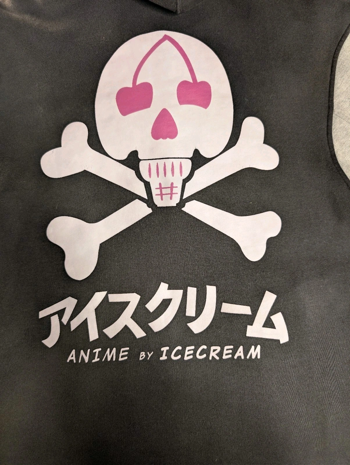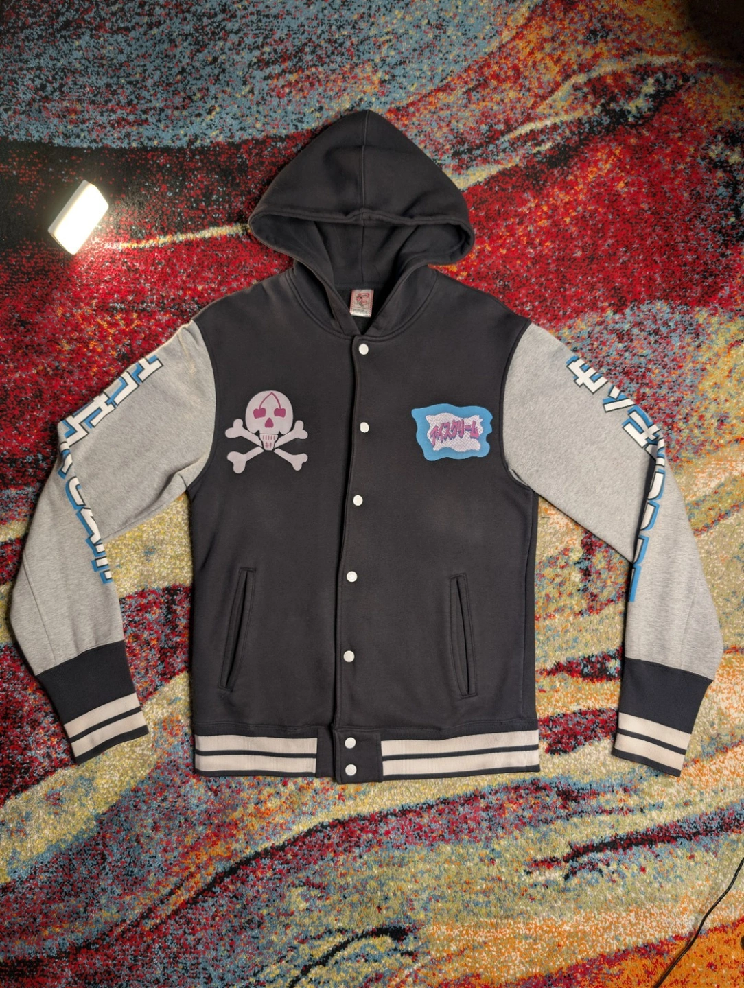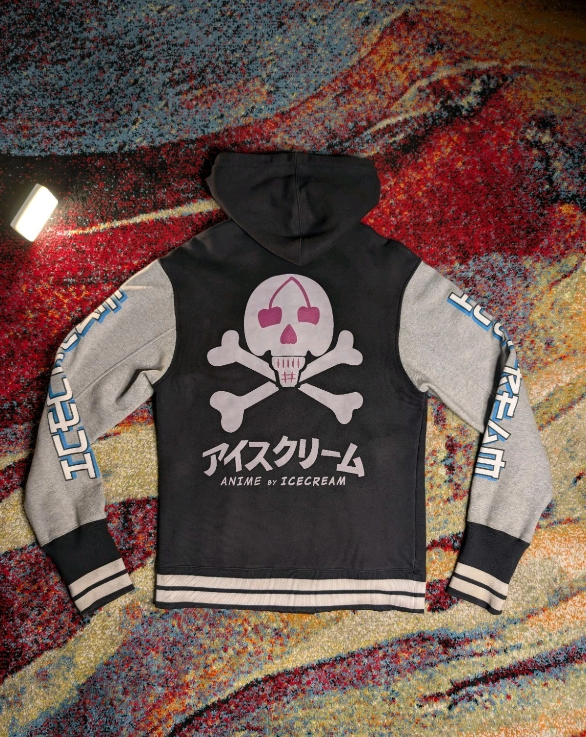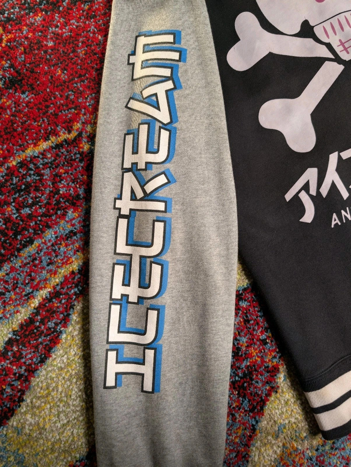 Men's Icecream varsity jacket in size M. Features a graphic print with a skull theme, long sleeves, and a hooded neckline. Made from a cotton and polyester fleece blend. Black and gray color with snap button closure and striped cuffs. Suitable for fall and winter wear. Machine washable.