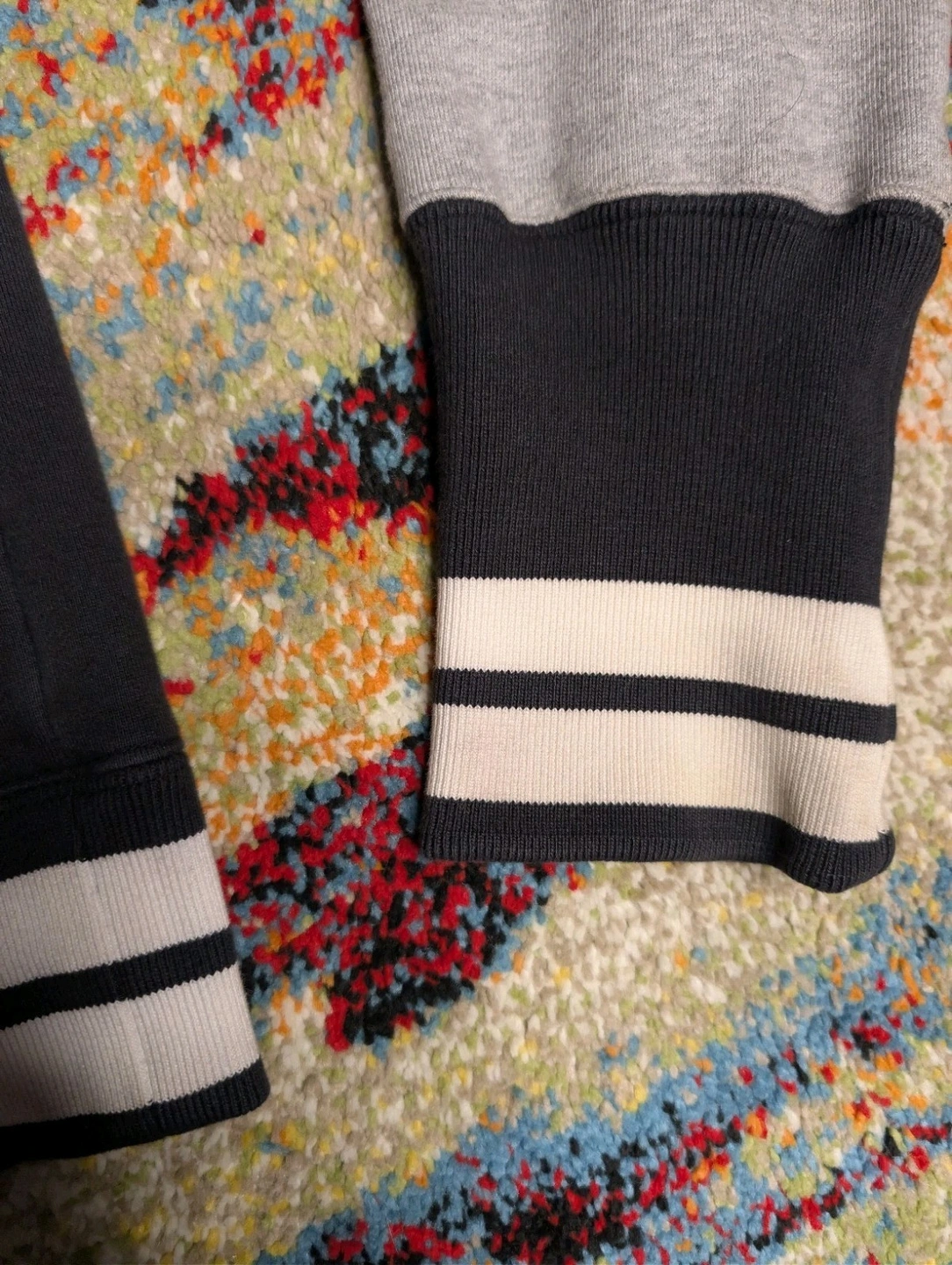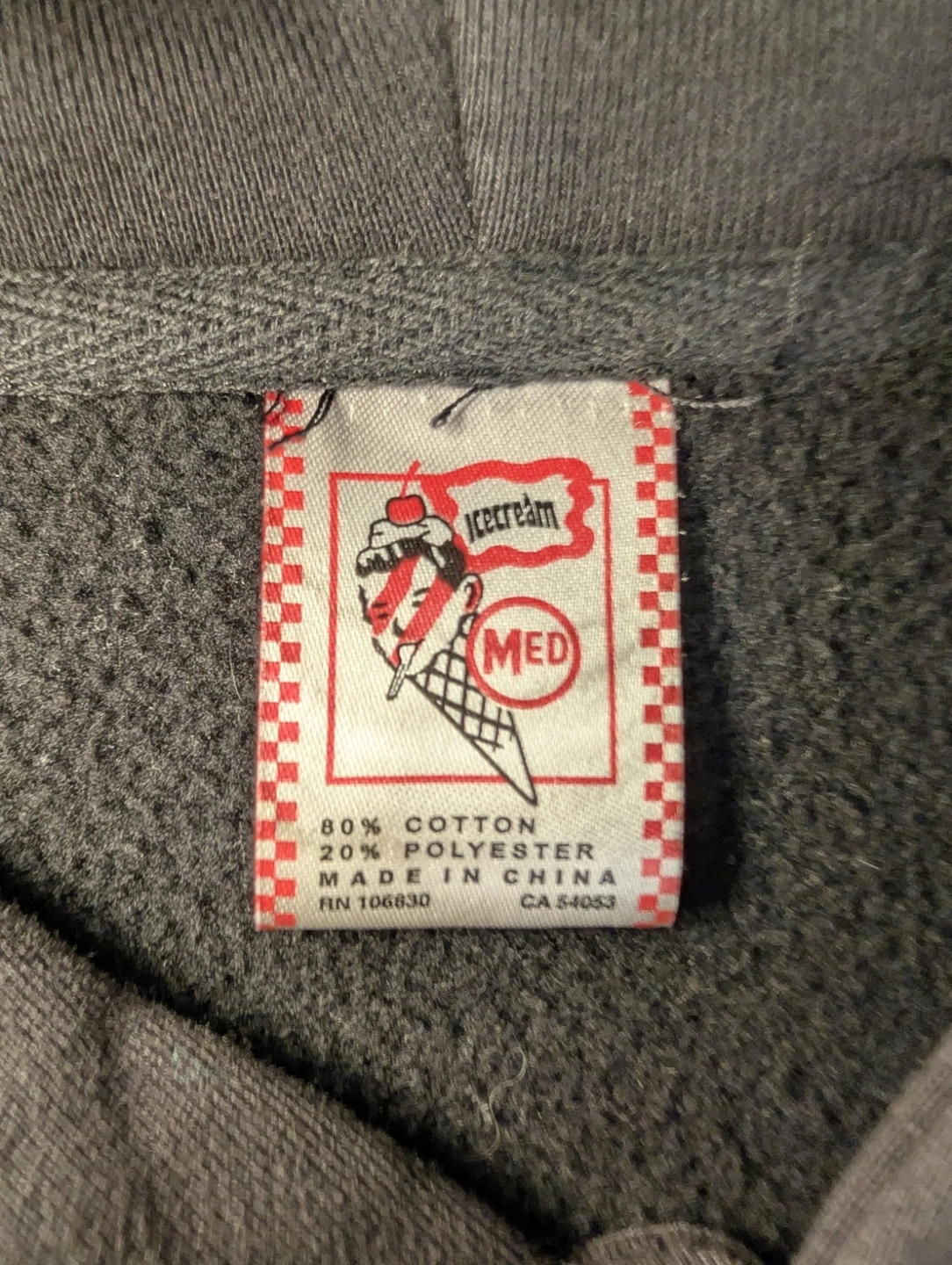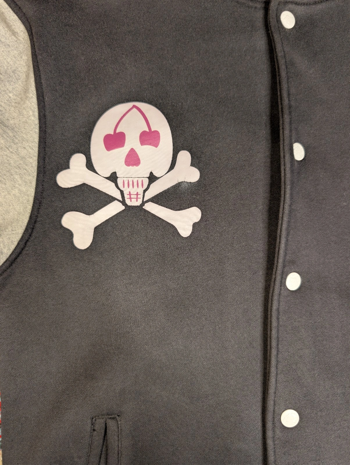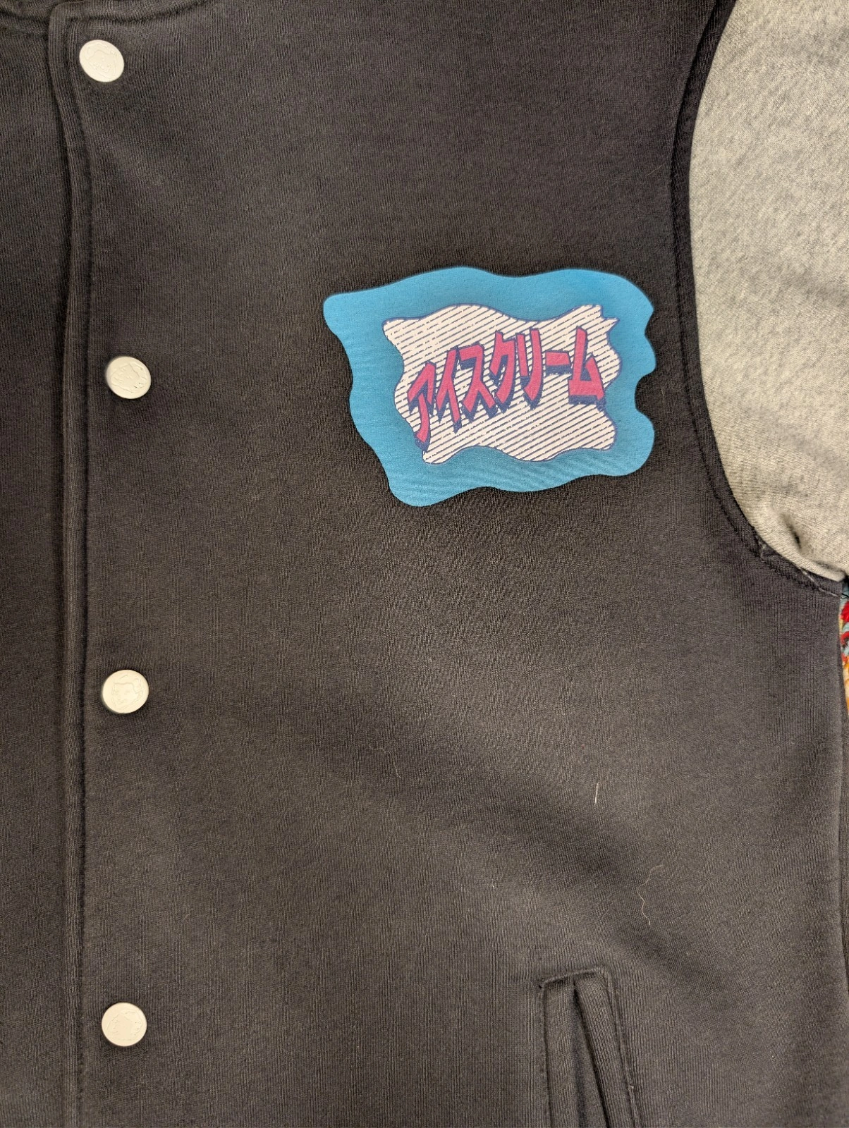 Men's Icecream varsity jacket in size M. Features a graphic print with a skull theme, long sleeves, and a hooded neckline. Made from a cotton and polyester fleece blend. Black and gray color with snap button closure and striped cuffs. Suitable for fall and winter wear. Machine washable.