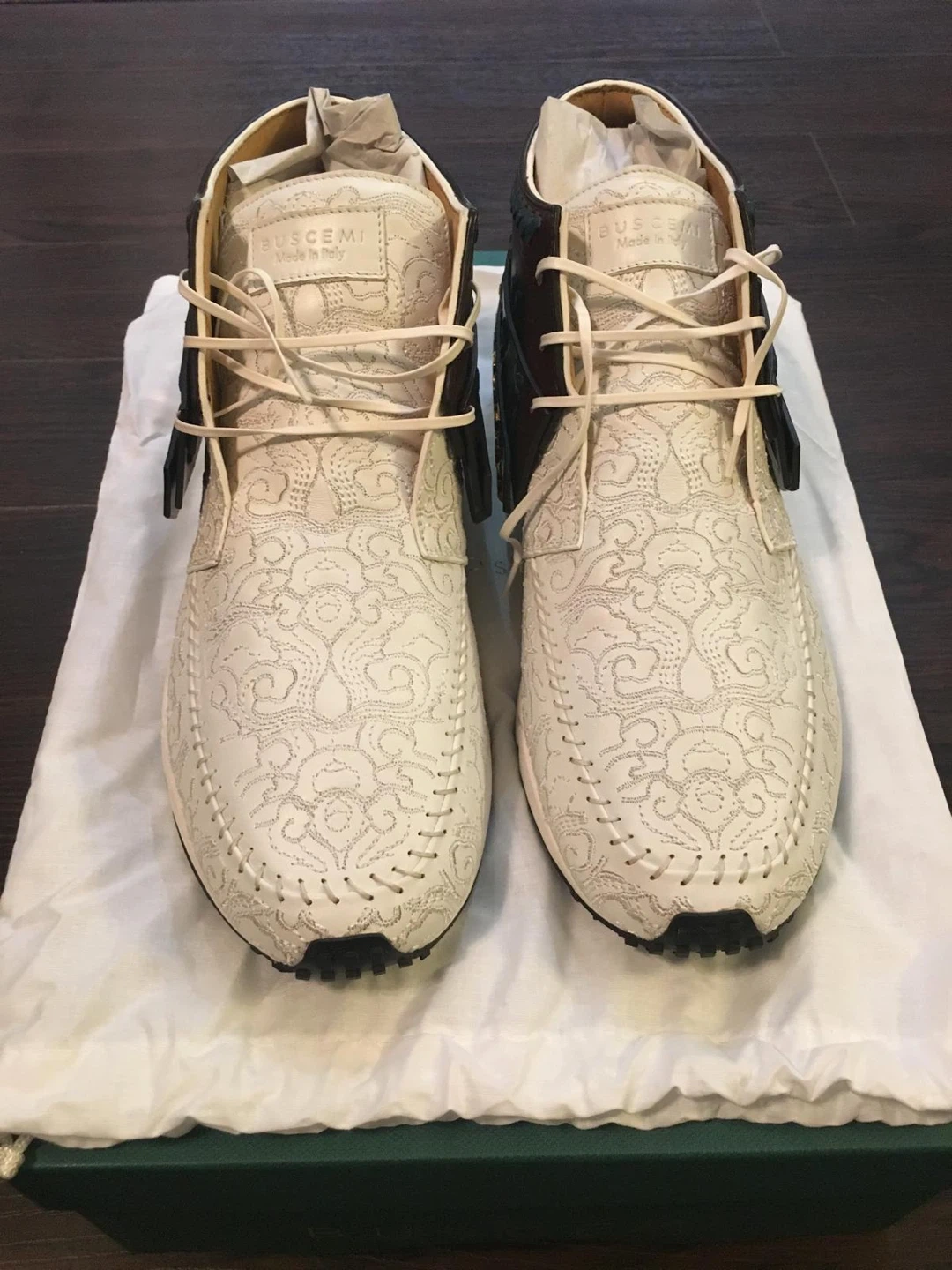 39Selling a pair of Buscemi Japan Gladiator sneakers in white! These shoes are in great condition and come with the original box. They feature a unique design with brown leather accents and gold stud detailing. The soles are made by Vibram for excellent grip and durability. Originally, these retailed for $2590! Never used,