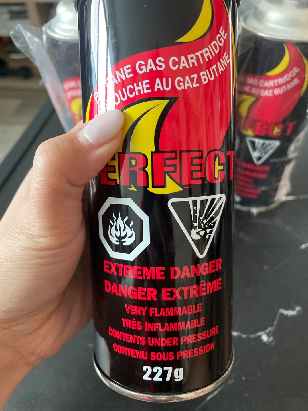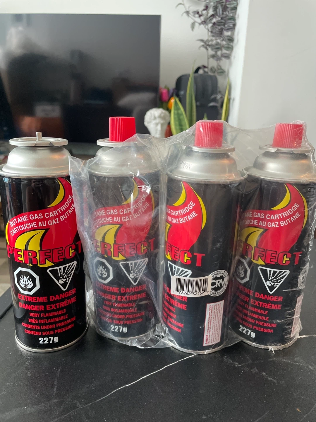 85Selling a pack of four Perfect butane gas cartridges. Each cartridge contains 227g of butane. They're very flammable and should be handled with care. All full.
