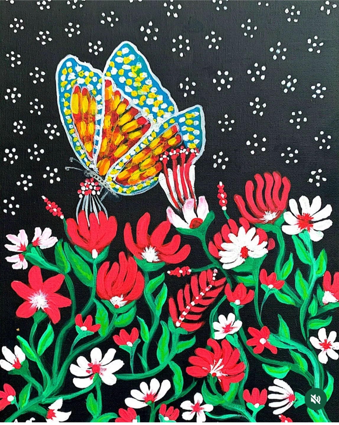 Beautiful painting of a butterfly and flowers on a black background. The colours are vibrant and the painting is in great condition. Perfect for adding a touch of nature to any room Acrylics on canvas 16X20”
