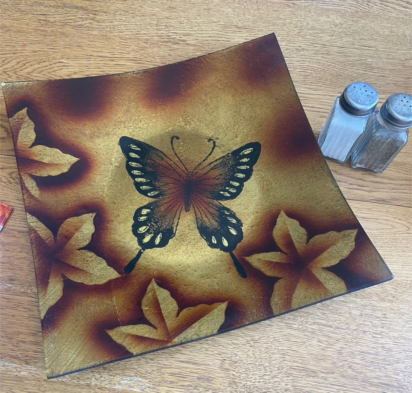 A lovely decorative plate featuring a beautiful butterfly design! The plate has a square shape and a warm, earthy colour palette. It would make a great addition to any home decor