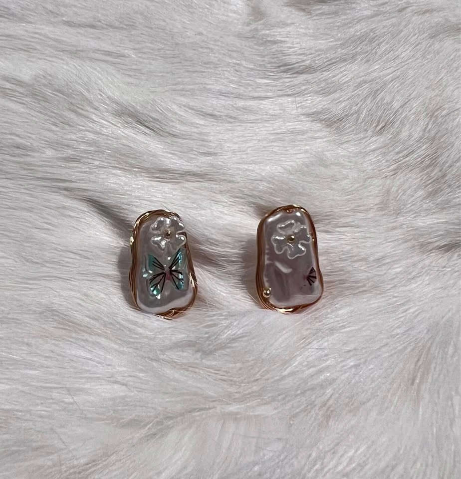 Elegant, minimalist earrings that bring a touch of nature to your look. Featuring one delicate butterfly and one floral motif, each earring is carefully crafted with a soft pastel enamel finish and framed with a subtle gold-tone border. The design is asymmetrical, adding a modern twist to a classic, nature-inspired theme. Whether you’re dressing up for a special occasion or looking to add a whimsical detail to your everyday outfit, these earrings are sure to captivate.