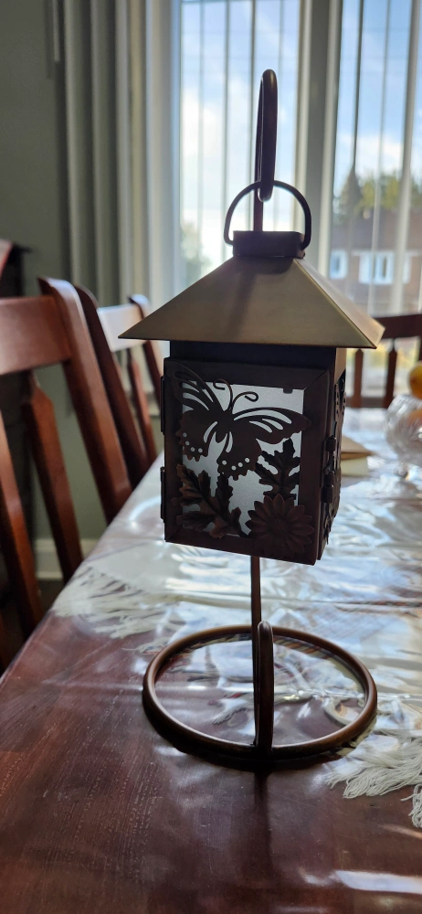 This is a cute metal lantern with a stand. It features butterfly and floral cutouts on the sides. Perfect for adding a touch of whimsy to any room! price only cash only pickup no delivery meet up 801 O'Connor drive East York outside TD Canada Trust bank door.