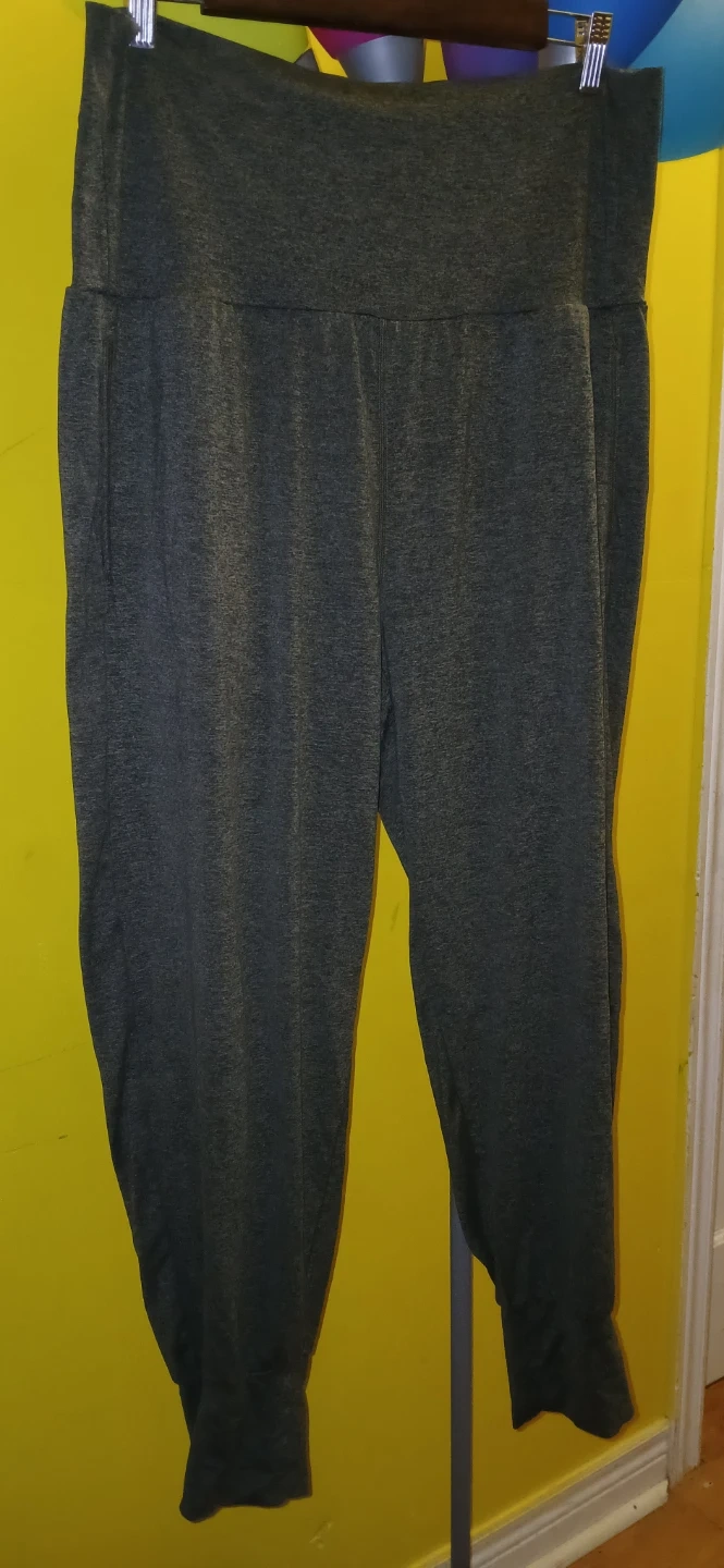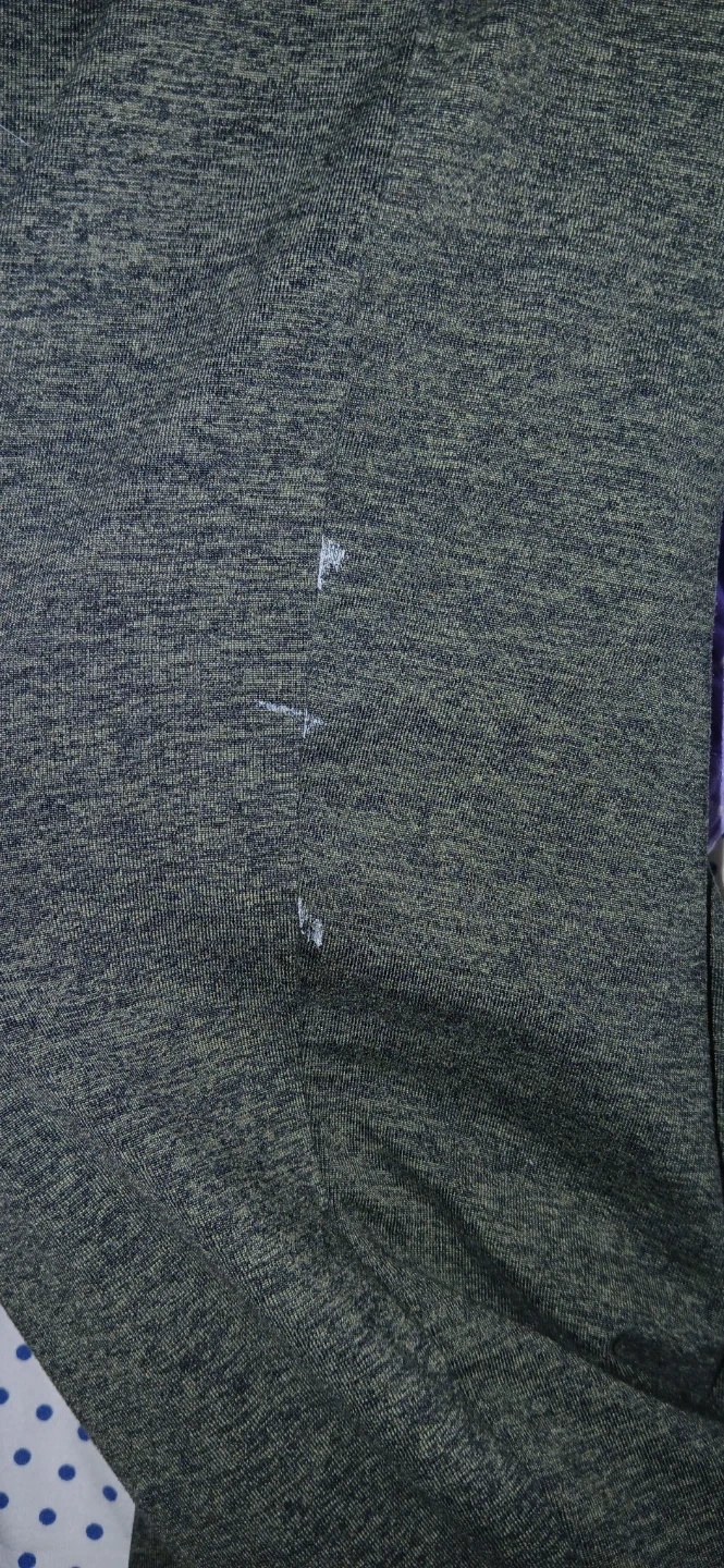 15The fabric is hard to resist, butter soft! Size large- fits more like L/XL- lots of flow in the legs. Left outer leg seam *three discoloration marks- acrylic paint* will not wash off See last photo