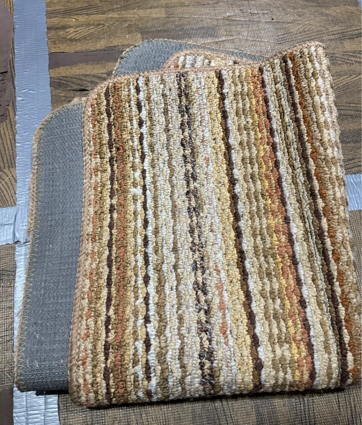 This accent rug features a textured striped pattern in warm earth tones. It has a non-slip backing for added safety. Rug material is durable and easy to clean.