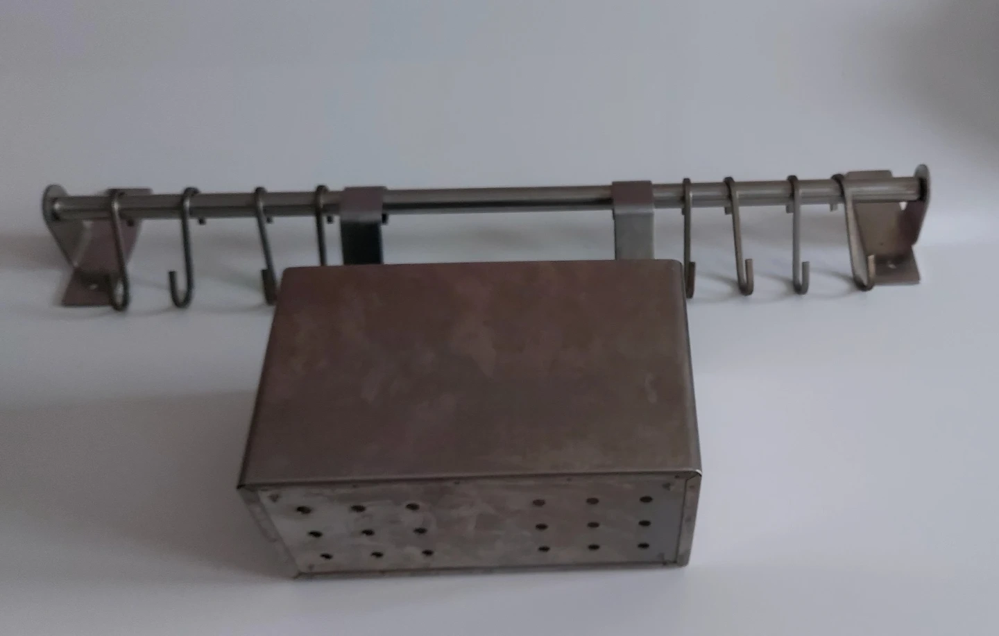 Selling an Ikea stailess rail with a container and hooks. Great for kitchen storage and organization! It's in good condition and ready to use.