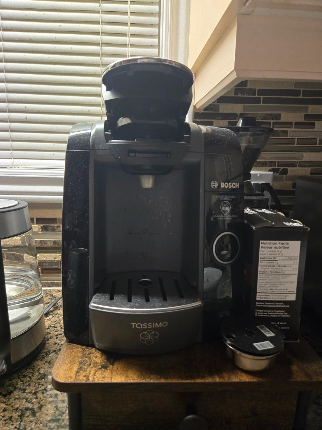 This is a Bosch Tassimo coffee machine. It uses intelligent barcode technology for brewing. It's black and has a compact design. Comes with a bunch of pods and will clean the machine so its like new