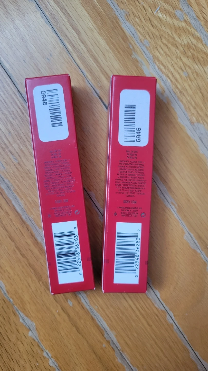 Two DKNY Be Tempted Eau de Parfum rollerballs. Each rollerball is 10ml, for a total of 20ml. They're individually boxed. This perfume is a floral fruity fragrance.