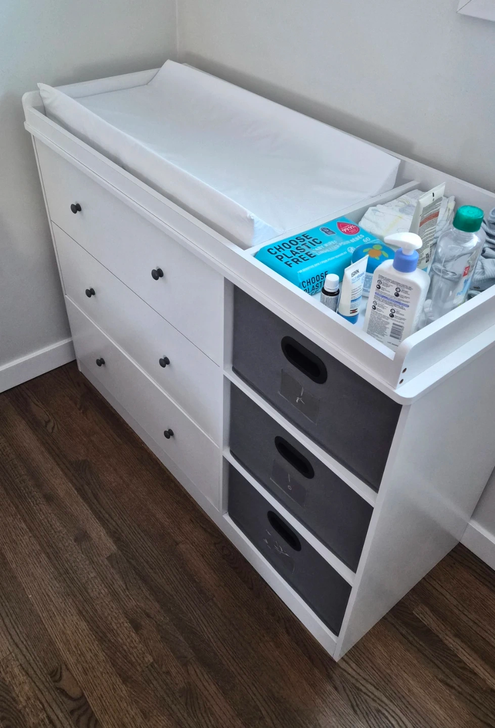 White dresser with three drawers and three fabric bins, perfect for nursery storage. Includes a changing pad on top. Great for organizing baby essentials!