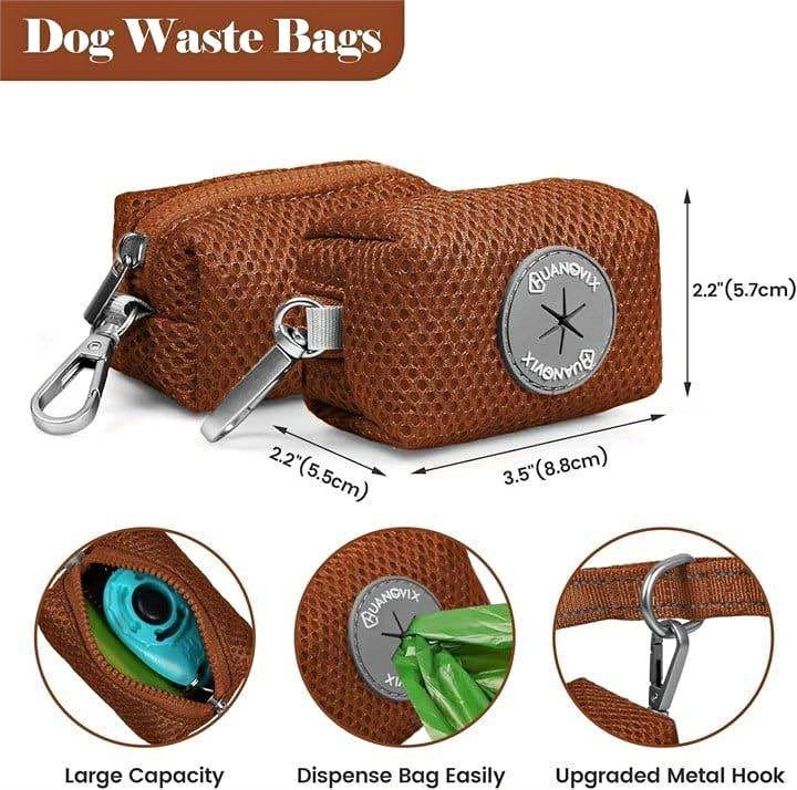 Handy QUANGVIX dog poop bag dispenser in brown mesh material. It's compact, measuring about 2.2 x 3.5 x 2.2 inches. Features a strong metal hook that clips easily onto your leash or belt. Dispenses bags smoothly and holds a good amount.