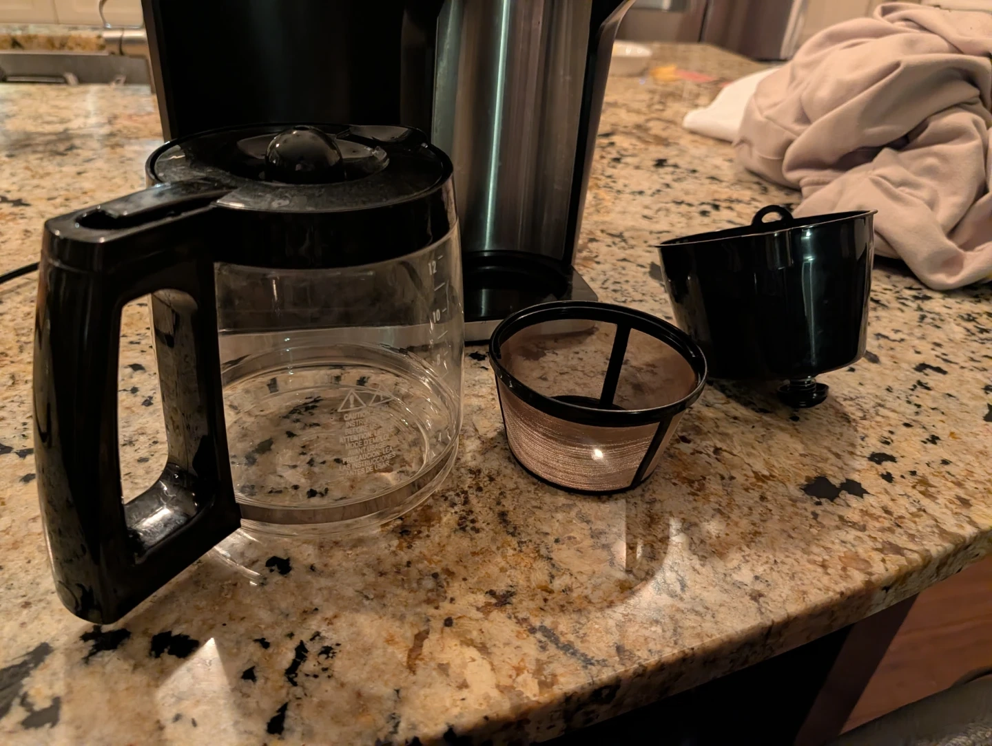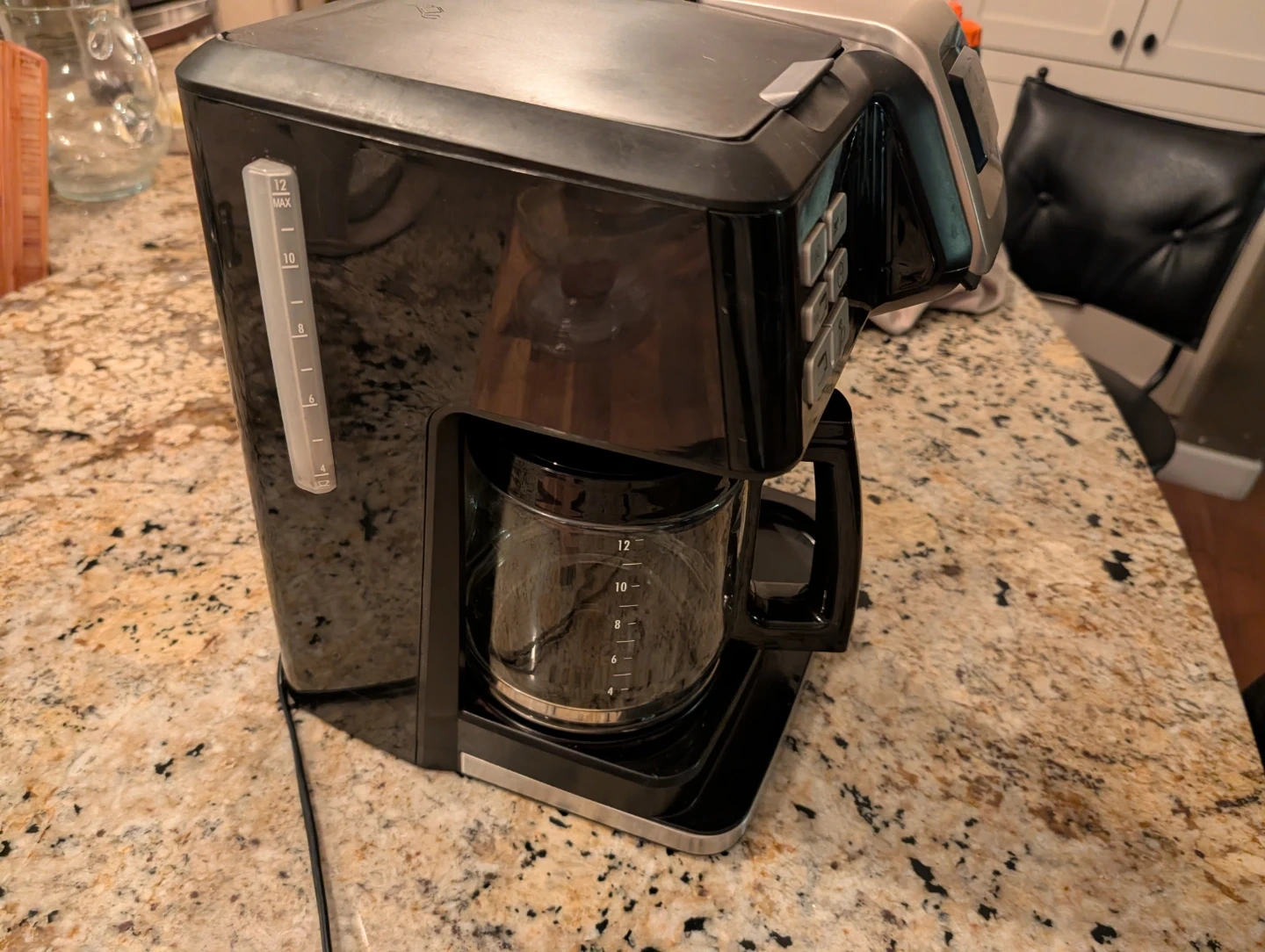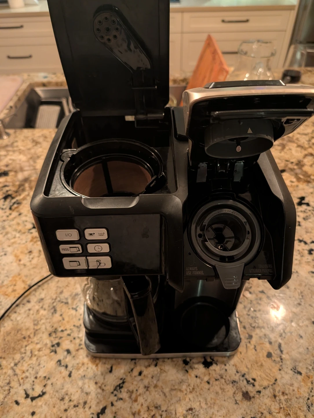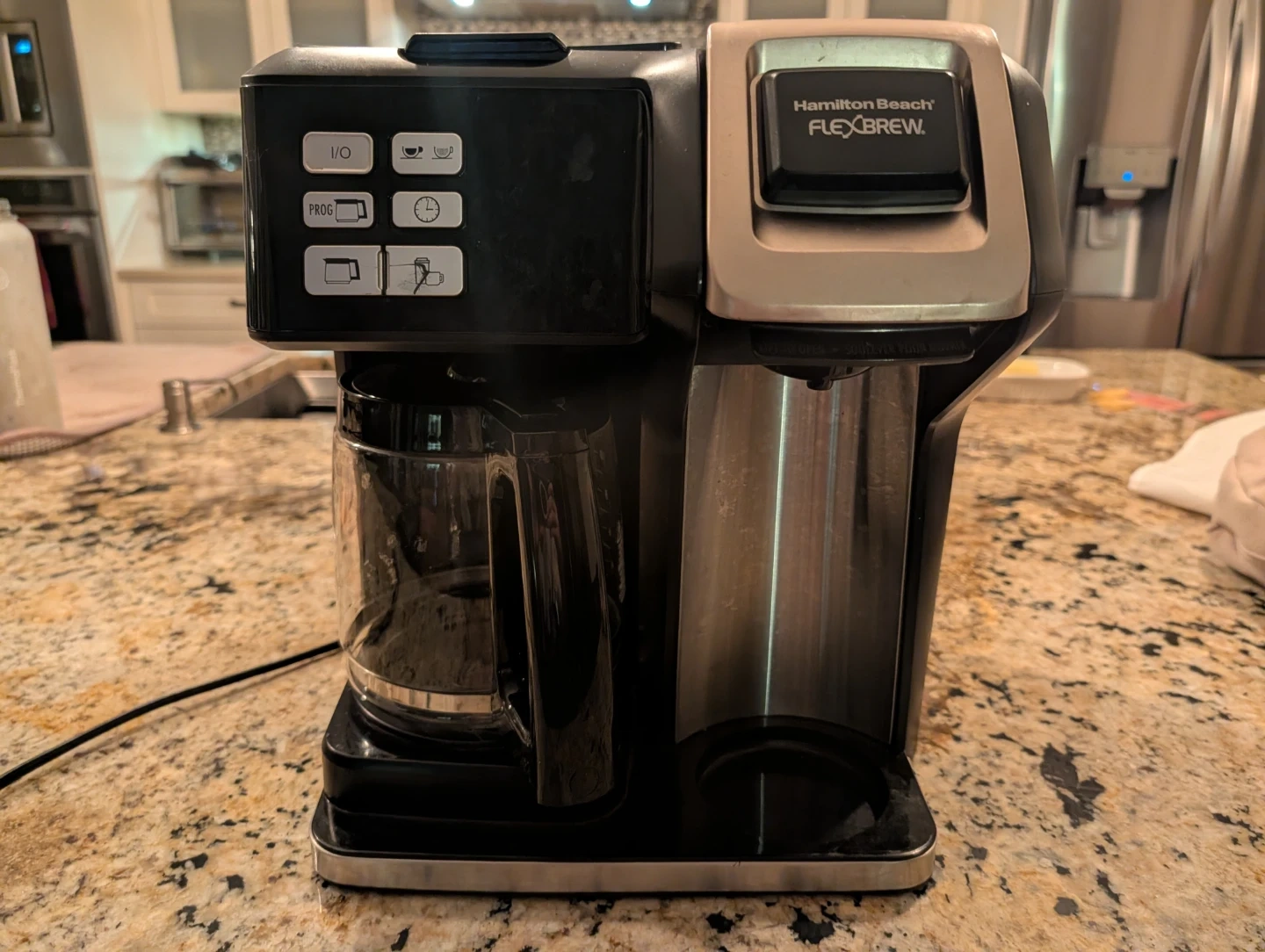 This Hamilton Beach FlexBrew coffee maker brews a full pot of coffee on one side and a single-serve K-Cup or coffee grounds on the other. It's a versatile machine for any coffee lover. Comes with a carafe and reusable filter.