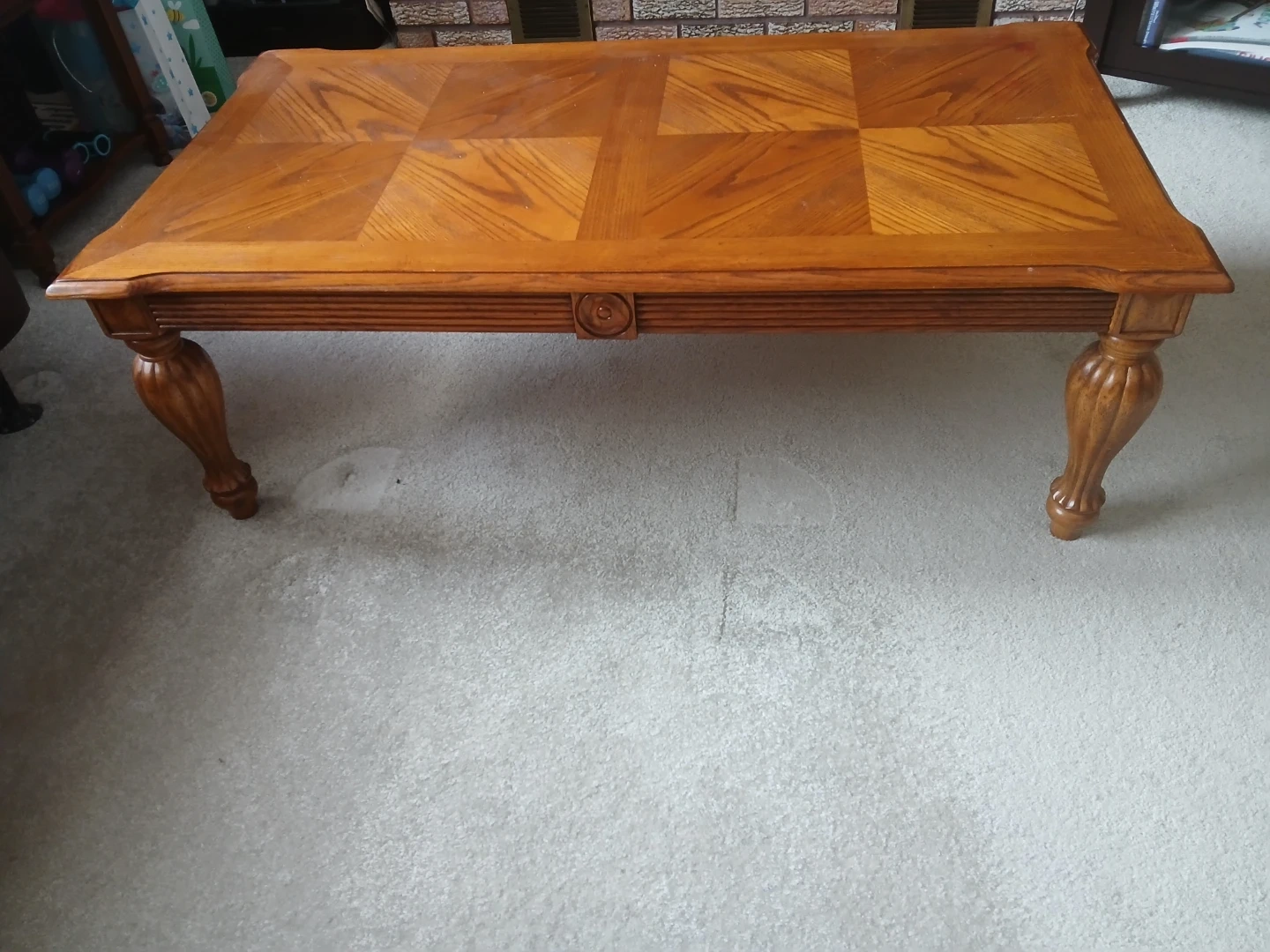 This classic and beautiful Oak coffee table has a decorative wood inlay top and carved legs. It's a nice size for a living room. Oak wood construction. Giving any room a classic character!