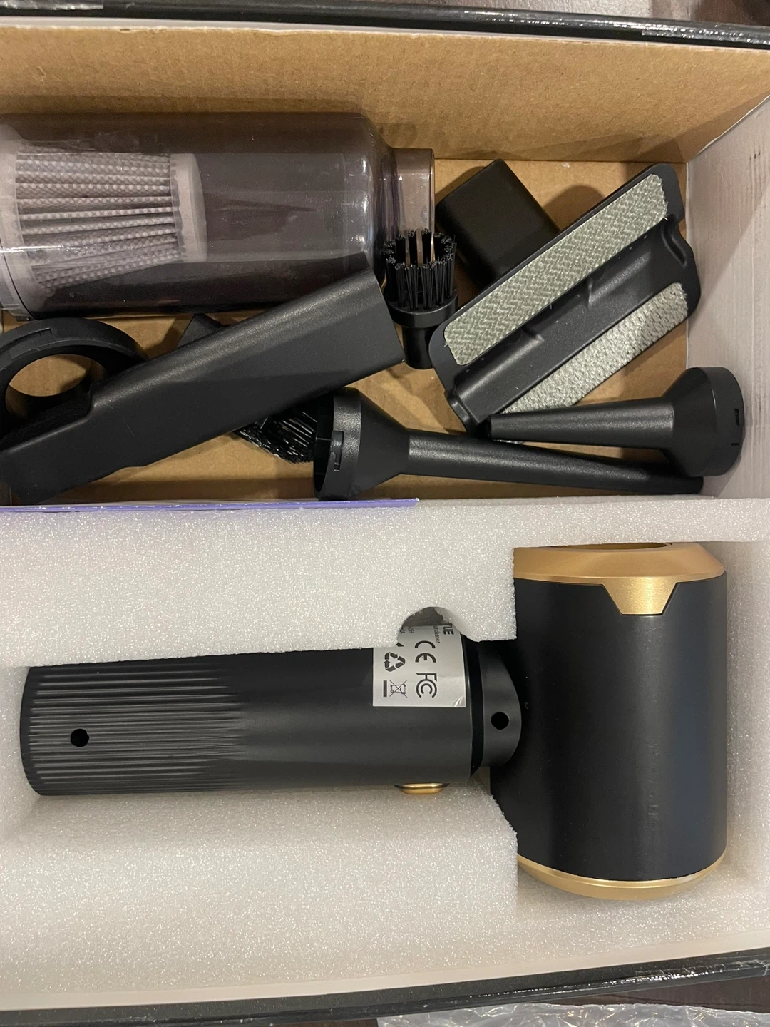 This portable vacuum cleaner is designed for home and car use. It's cordless and comes with multiple attachments. Includes dustbin, filter, and various brush heads. Compact and powerful for quick cleanups!