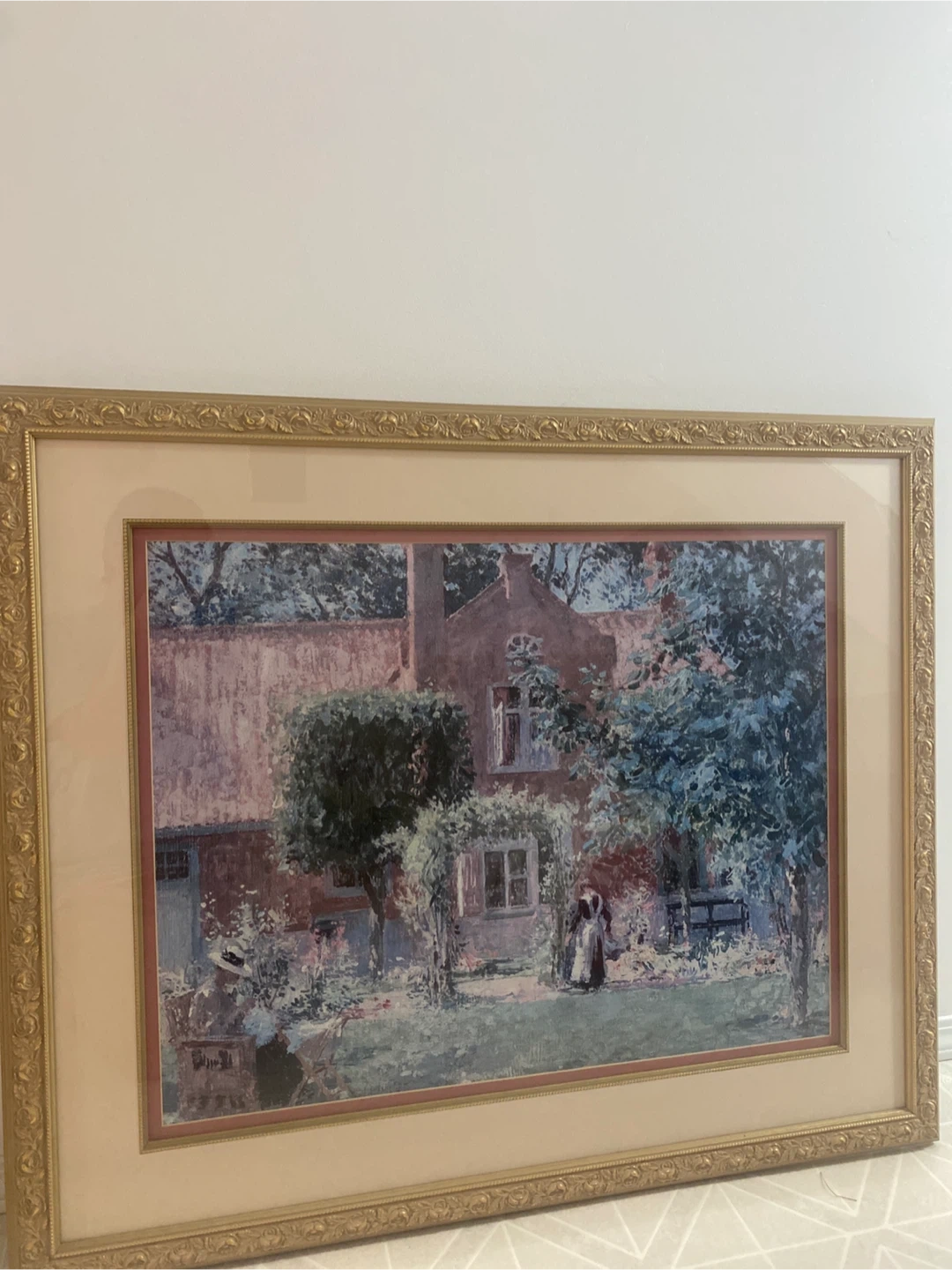 Lovely print featuring a picturesque cottage garden with a woman and dog. It's framed in an ornate gold-coloured frame. Adds a touch of charm to any room! Pick up cash only