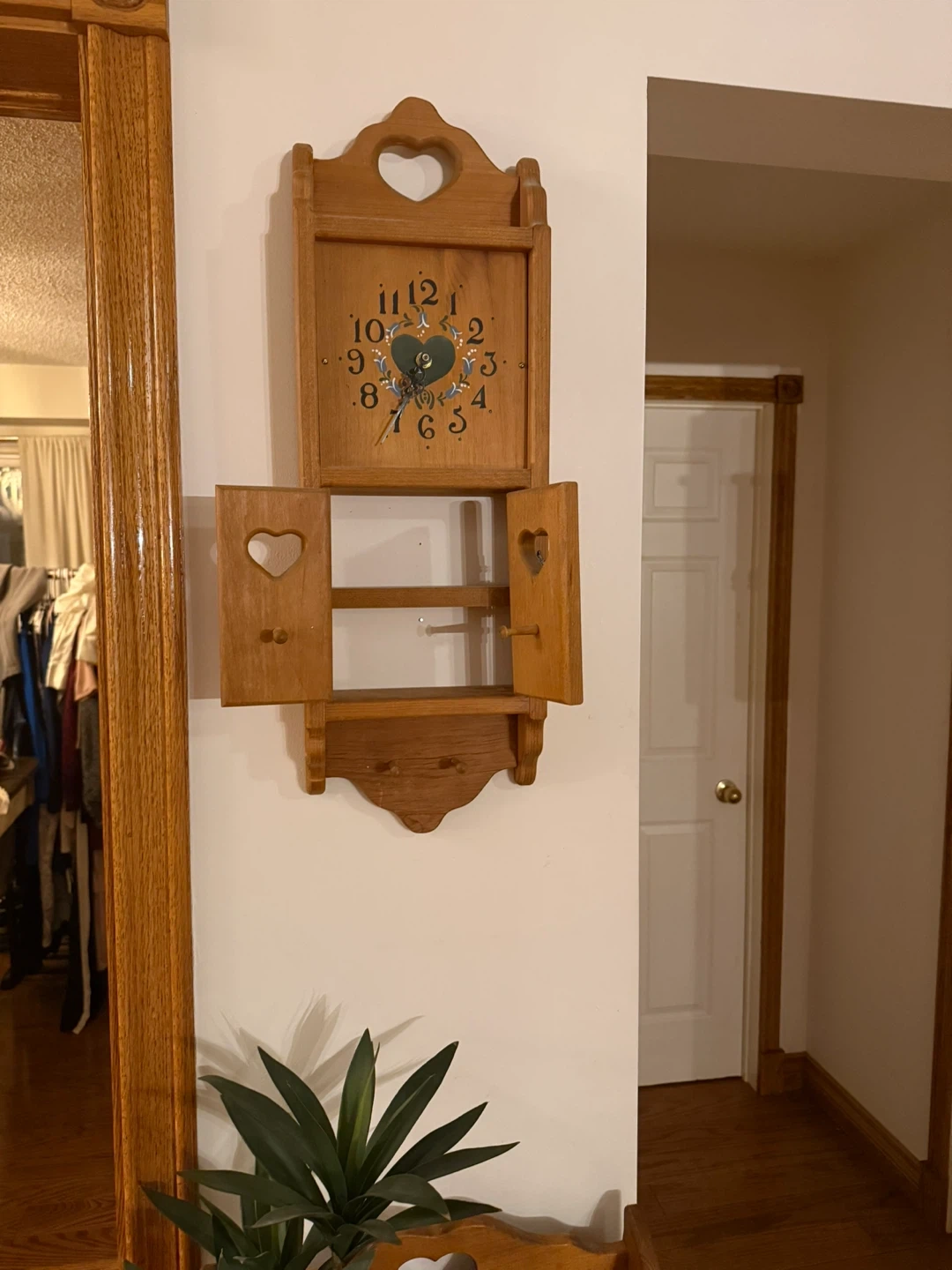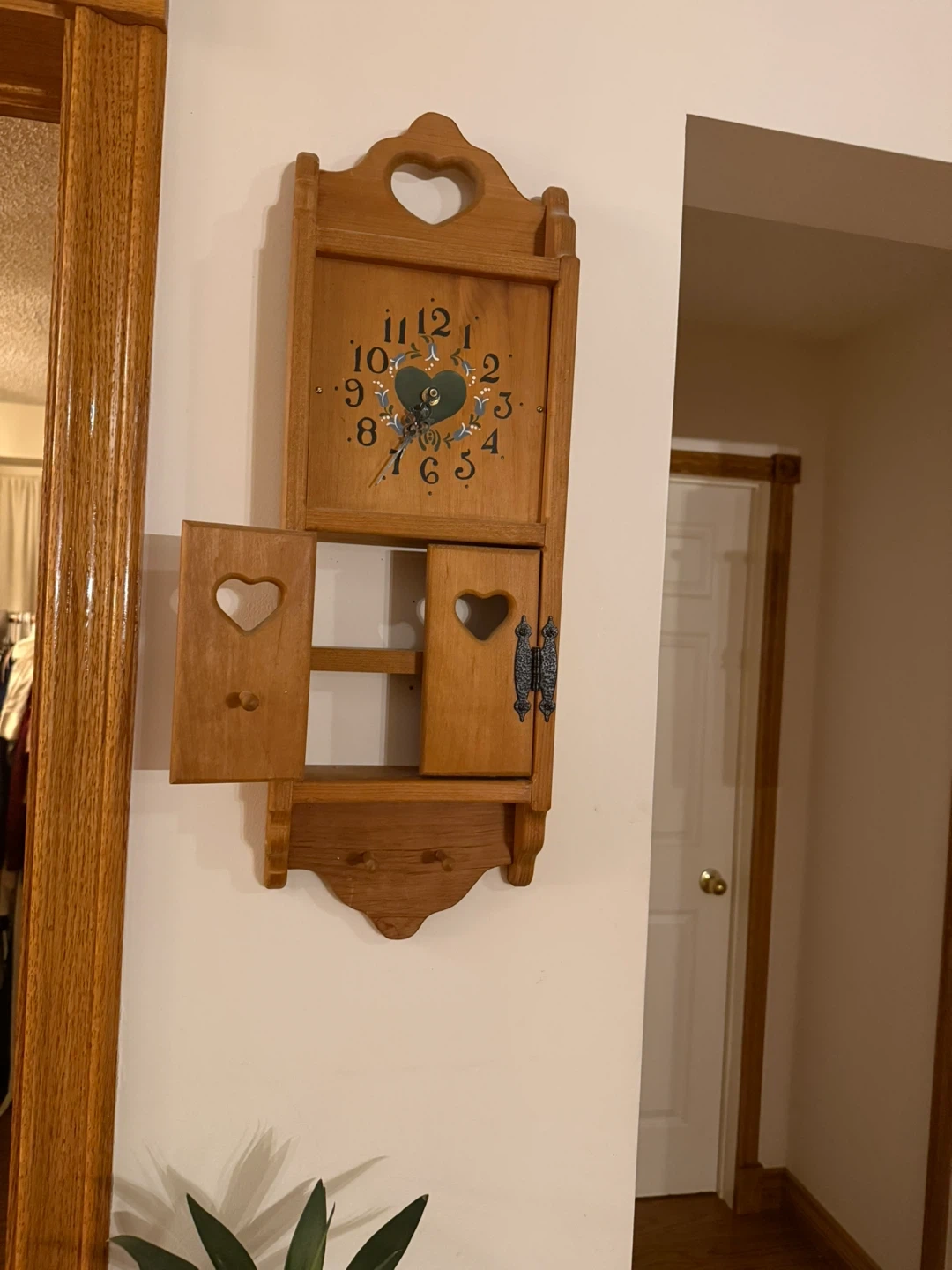 Cute wooden wall clock with a small storage area! Perfect for adding a touch of charm to any room. The clock face is easy to read, and the little doors open to reveal a handy spot for small items. It's in great shape and ready to brighten up your space
