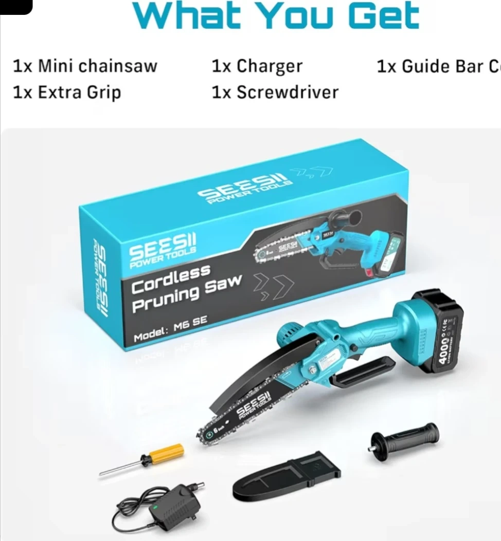This SEESII M6 SE is a cordless pruning saw. It includes the chainsaw, charger, screwdriver, an extra grip, and a guide bar cover. The battery is 4000mAh.