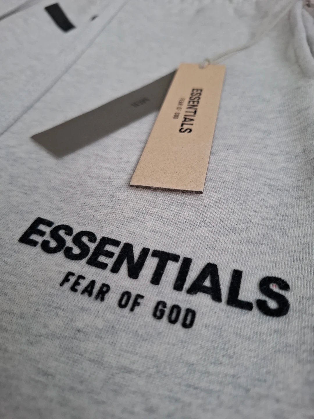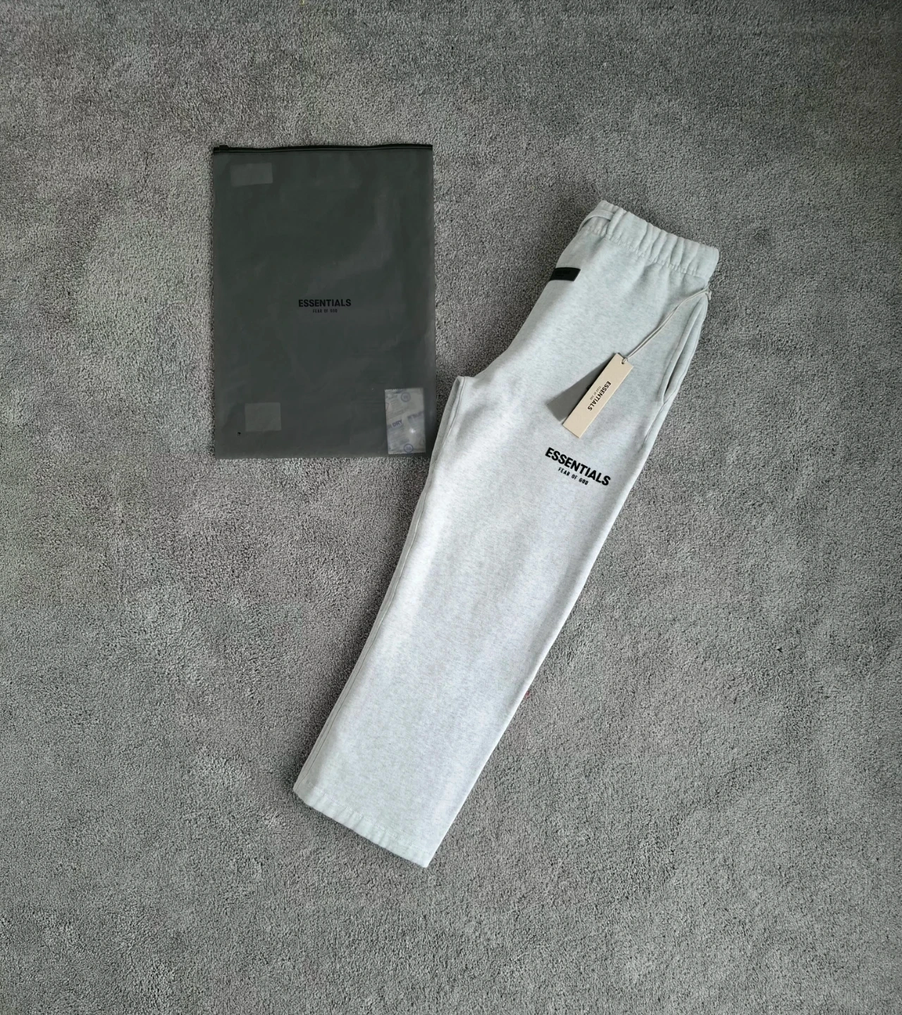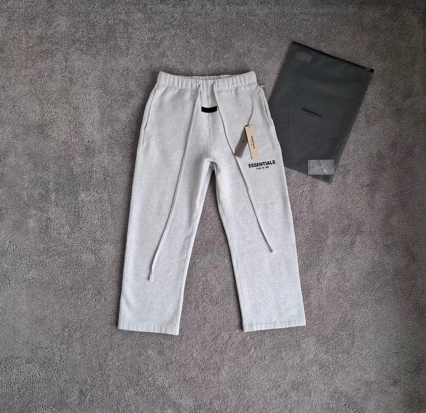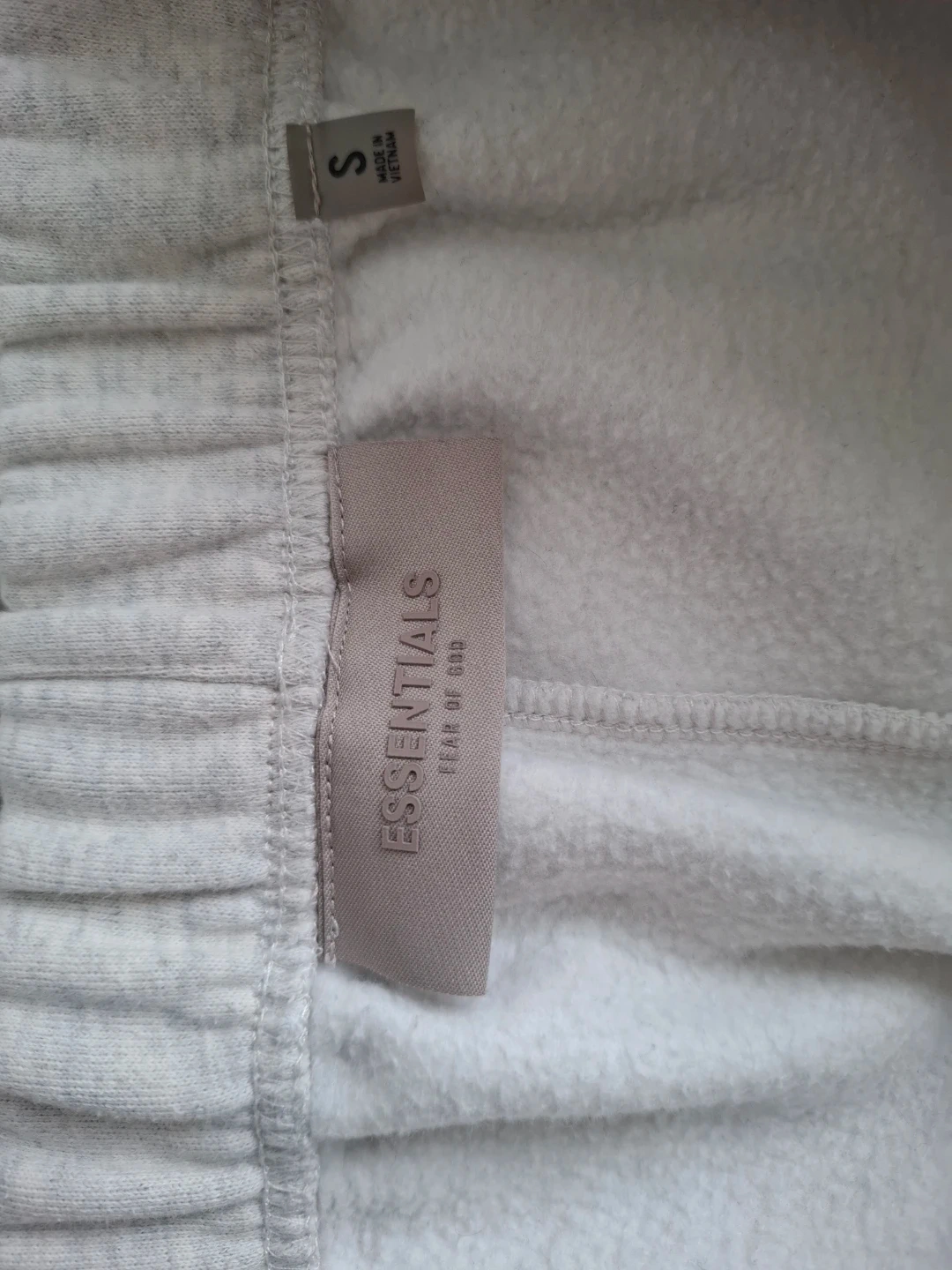 These ESSENTIALS sweatpants are a light oatmeal colour. They come with a drawstring waist and the ESSENTIALS logo printed on the leg. Includes the original packaging bag.