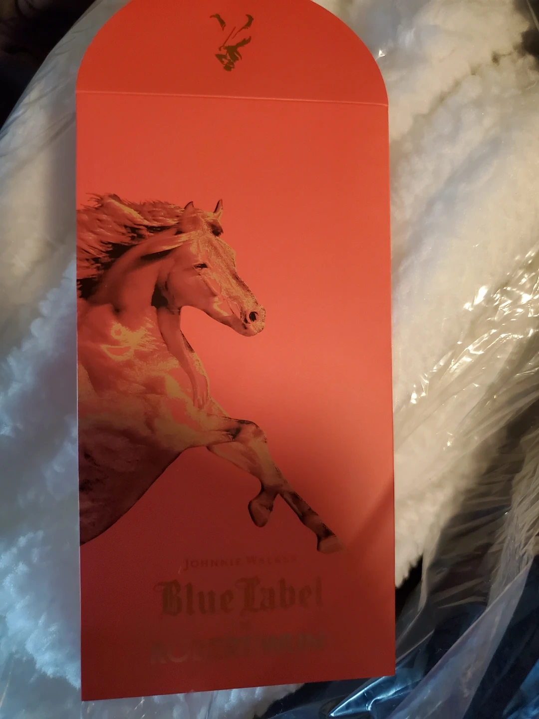 This is a special edition envelope for Johnnie Walker Blue Label by Robert Wun. It features a striking red design with a dynamic horse illustration. The envelope is designed to impress and would make a great collectible.