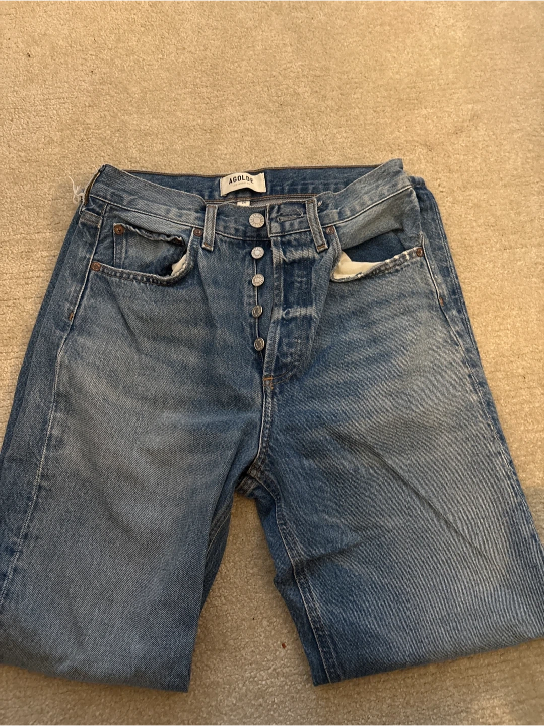 AGOLDE women's denim jeans in a medium wash. These jeans have a button fly and a straight leg cut. Cotton material.