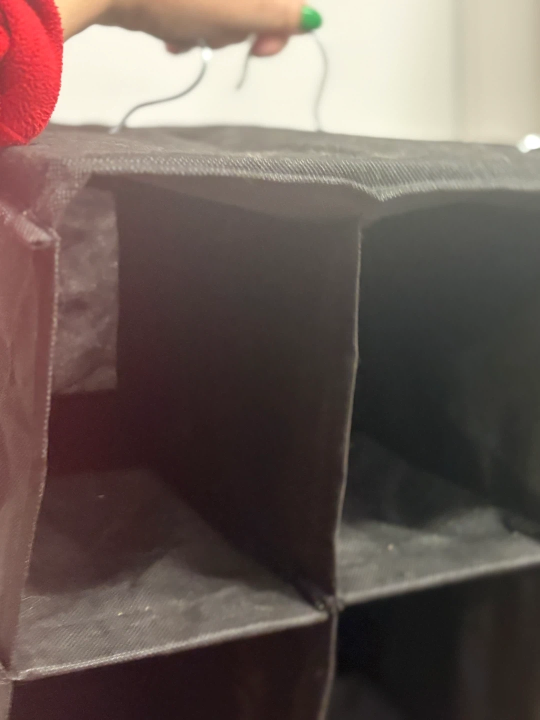Black fabric hanging closet organizer. It has 24 individual compartments for shoes or accessories. Comes with metal hooks for hanging in a closet.