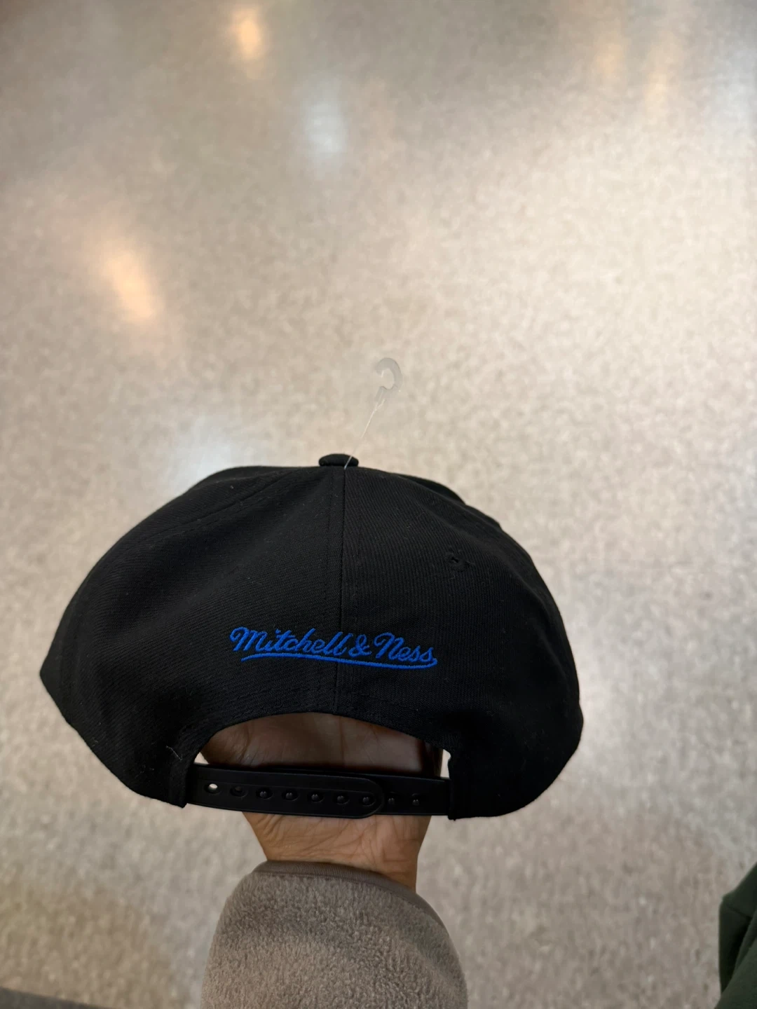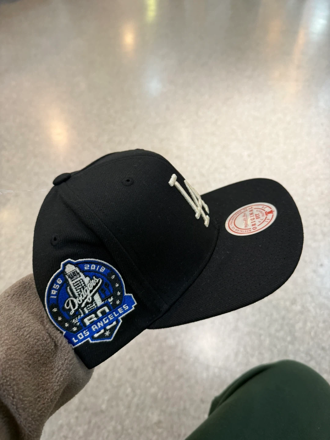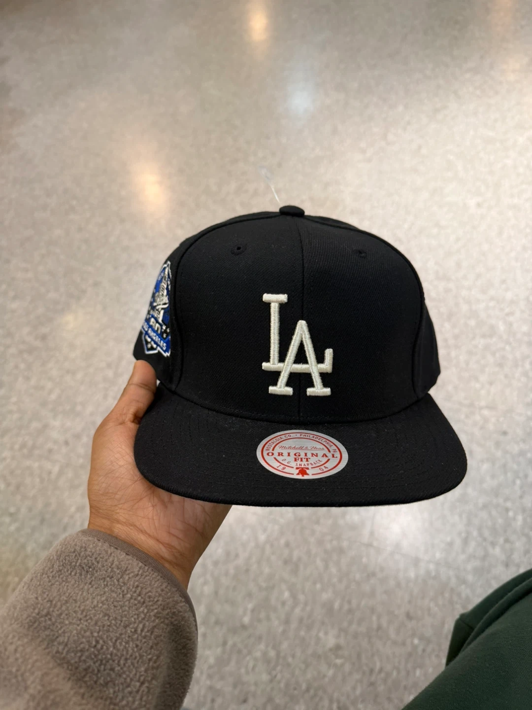 Black snapback hat featuring the LA Dodgers logo. It has 'Mitchell & Ness' embroidered on the back. Adjustable snap closure.