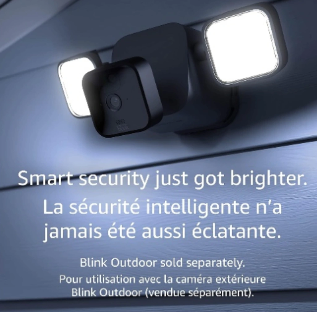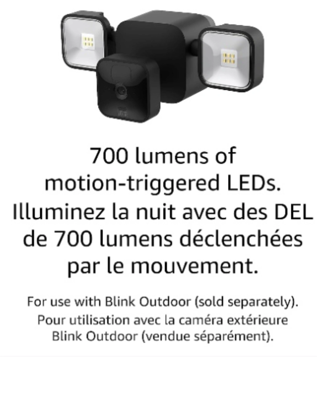 Battery-powered LED floodlight mount. 700 lumens. Motion-triggered. Weather-resistant. Accessory for Blink Outdoor camera (camera not included). Long-lasting battery.