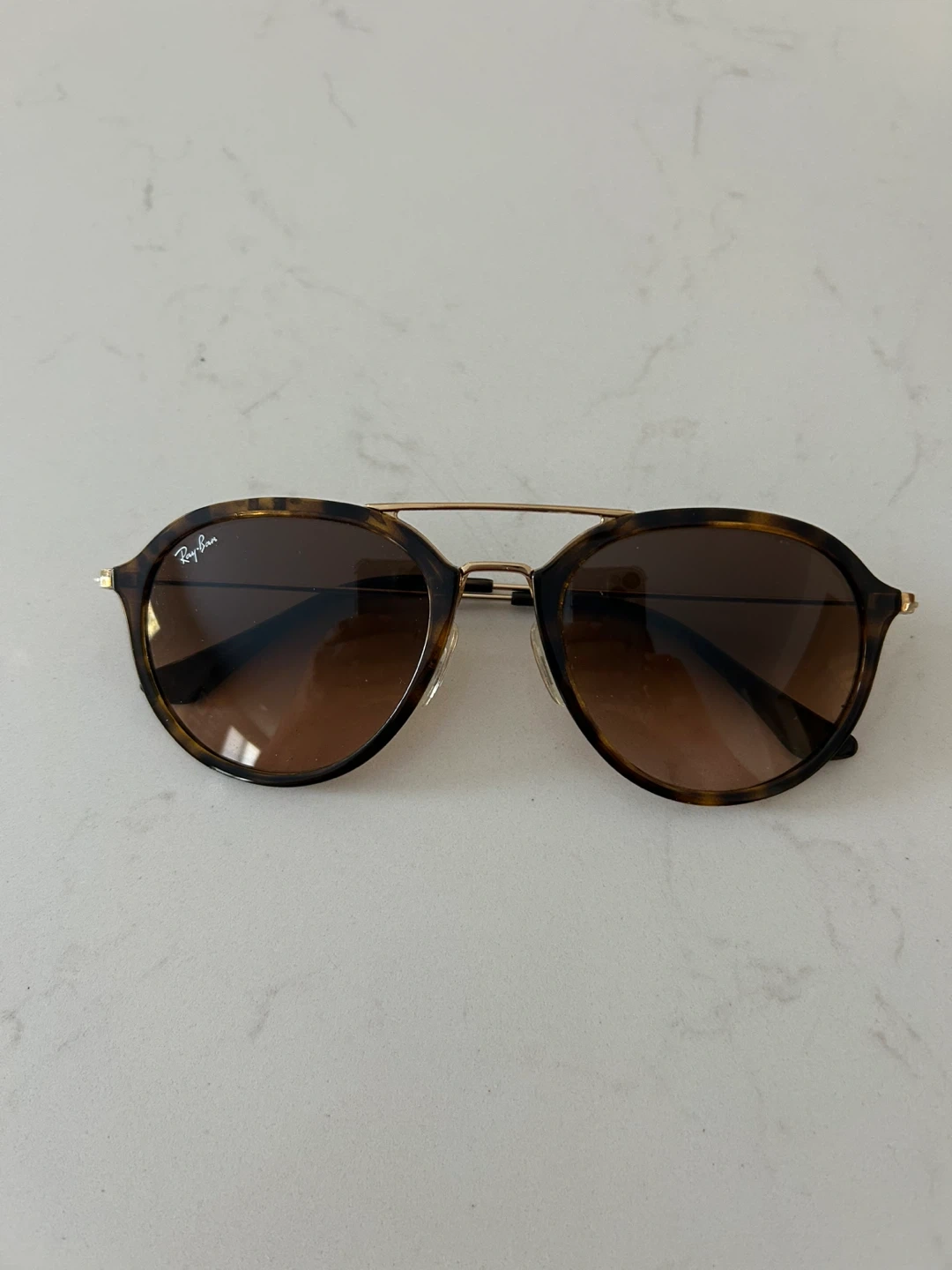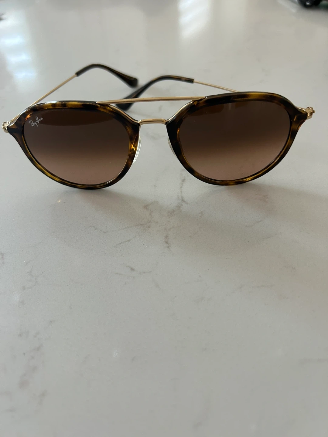 Stylish Ray-Ban sunglasses featuring a tortoiseshell frame and gradient brown lenses. Includes a brown faux leather case for protection. Perfect for sunny days!
