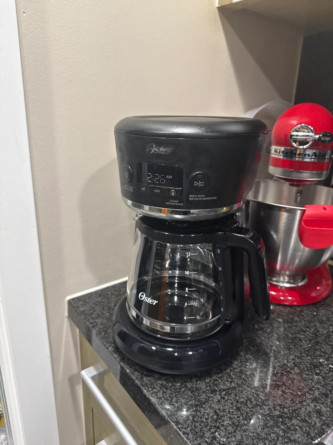 This Oster coffee maker is in black. It has programmable brew settings and a removable filter basket. Great for brewing your morning coffee!