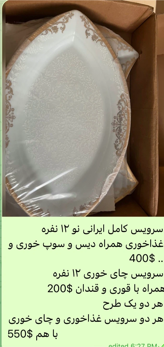 This is a new, 12-person Iranian dinnerware set. It includes serving dishes and a soup tureen, priced at $400. A matching 12-person tea set with a teapot and sugar bowl is also available for $200. Both sets share the same design. Get both the dinnerware and tea sets together for $550!