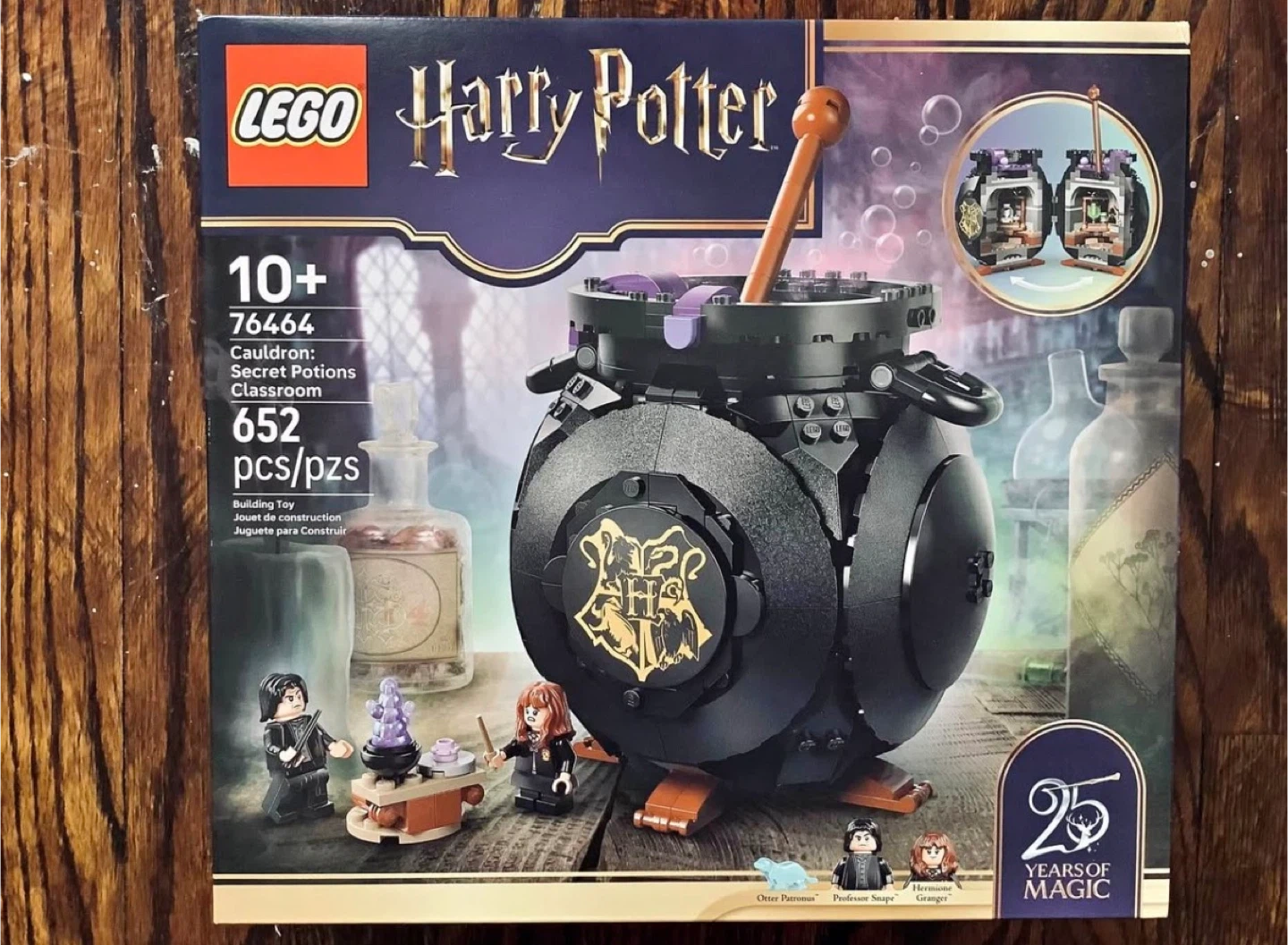 This LEGO Harry Potter set is the Cauldron: Secret Potions Classroom. It includes 652 pieces. The set comes with minifigures of Otter Patronus, Professor Snape, and Hermione Granger. It's great for fans of the Harry Potter series!