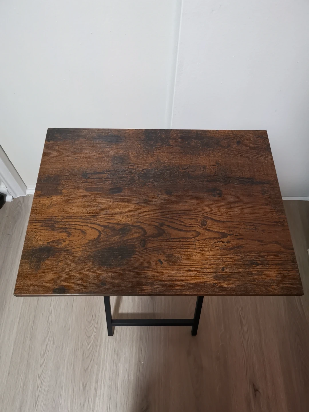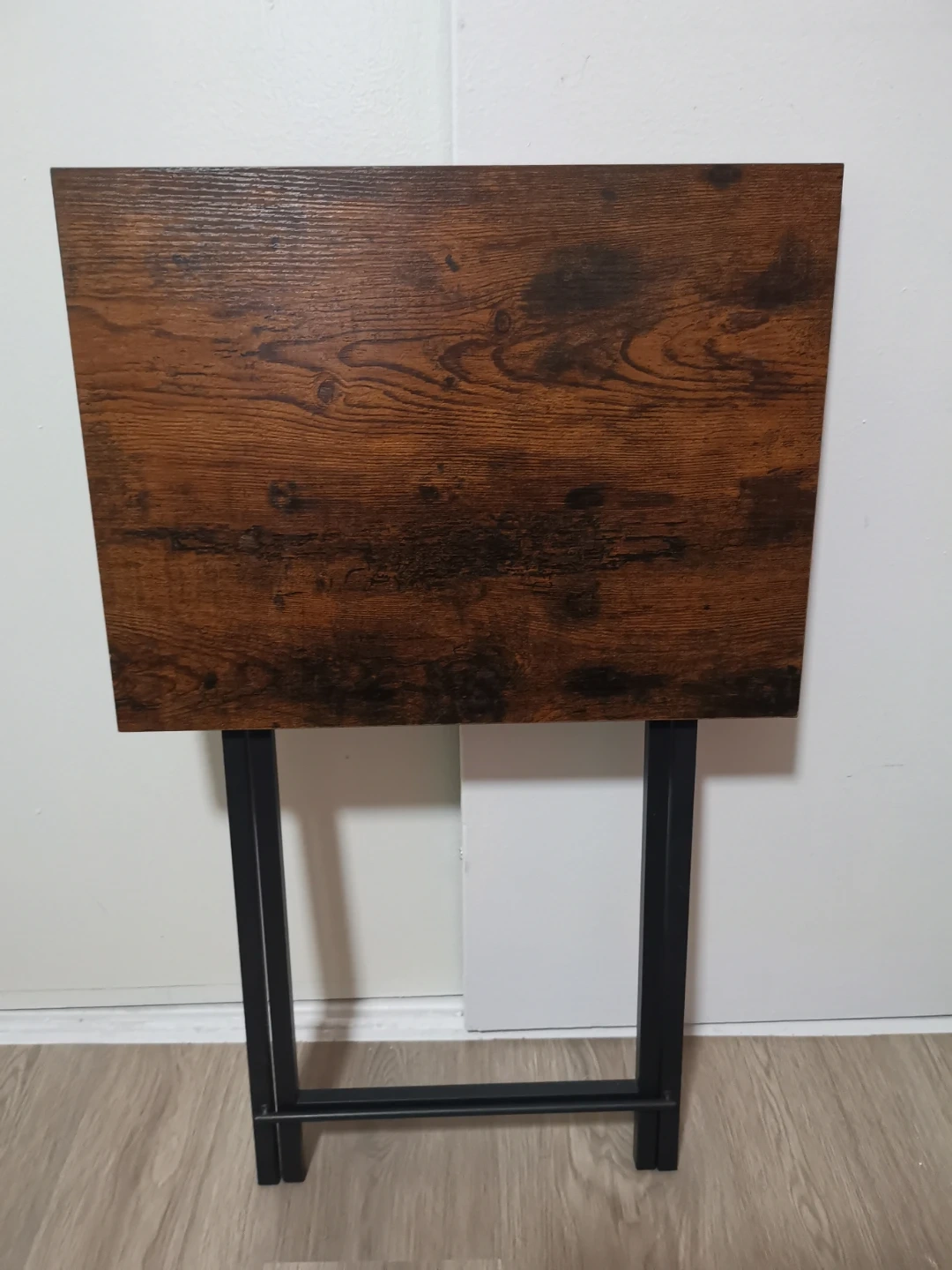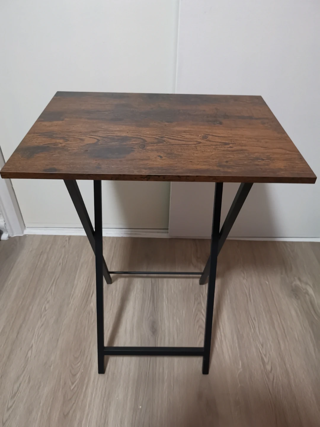 This is a folding accent table with a wood grain finish. It has black metal legs and a convenient folding design for easy storage. It's perfect for small spaces or as an extra surface when you need it!