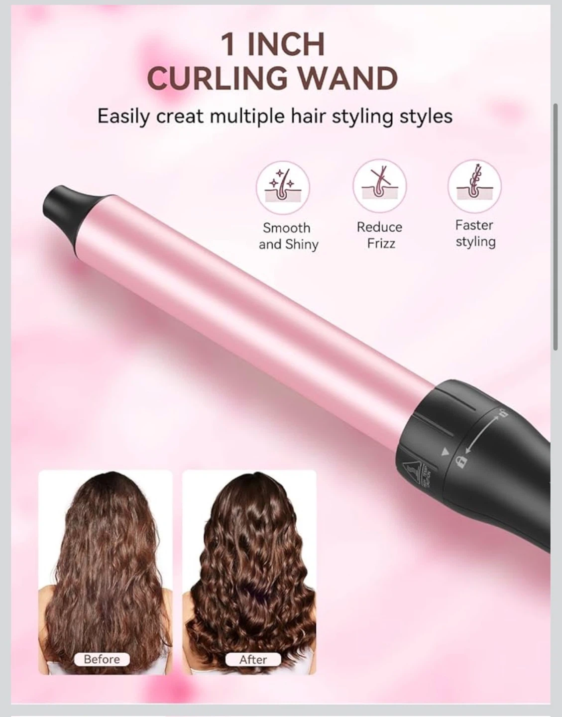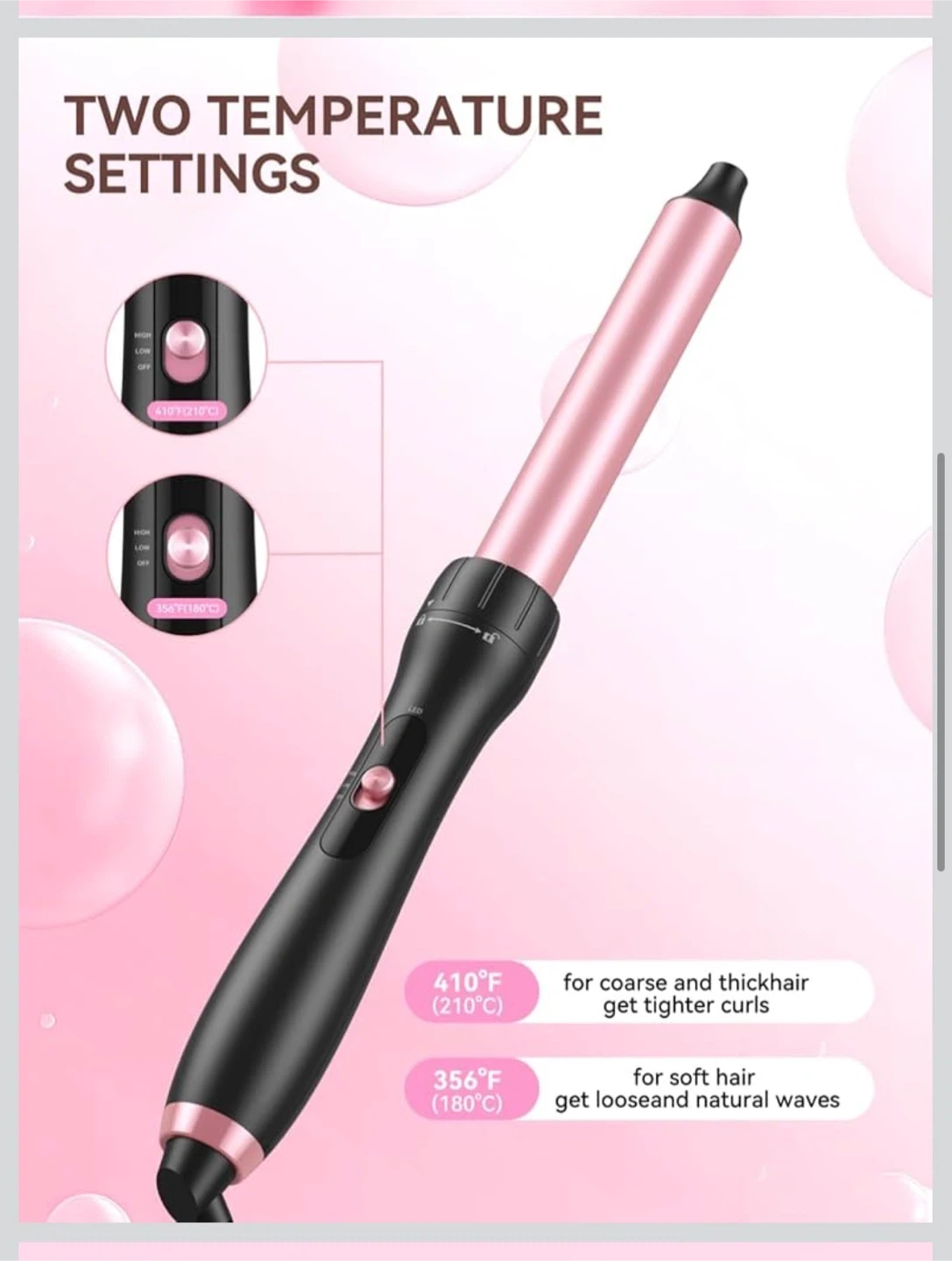 This is a 1-inch curling wand from LANDOT. It offers two temperature settings: 410°F (210°C) for coarse hair and 356°F (180°C) for soft hair. It features a 60-minute auto-off function and a 360° swivel cord for flexible use.