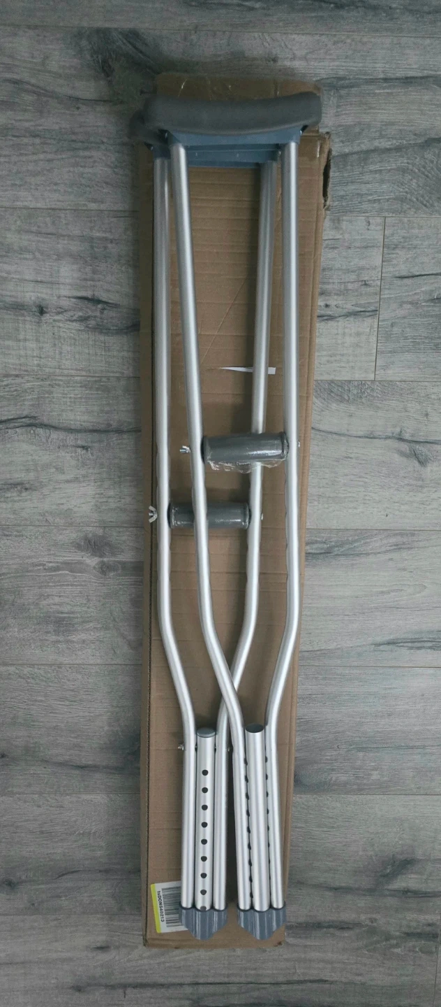 Selling a pair of adjustable aluminum crutches. They're lightweight and can support up to 300 lbs. The height is adjustable for people between 5'2" and 5'10". The handle height is also adjustable. Comes with the original box