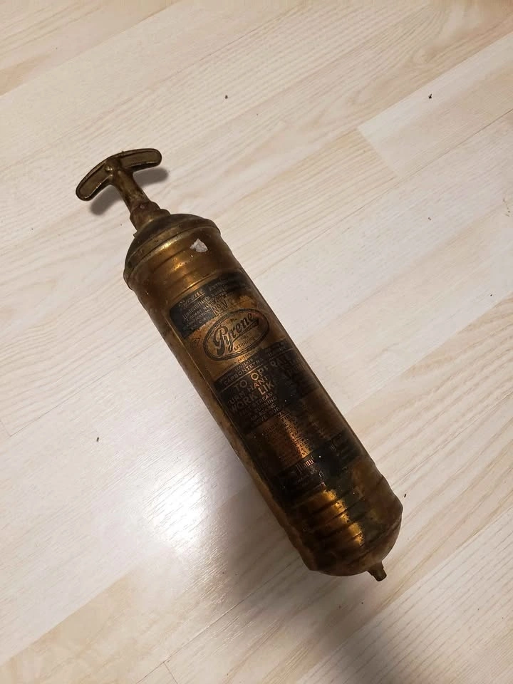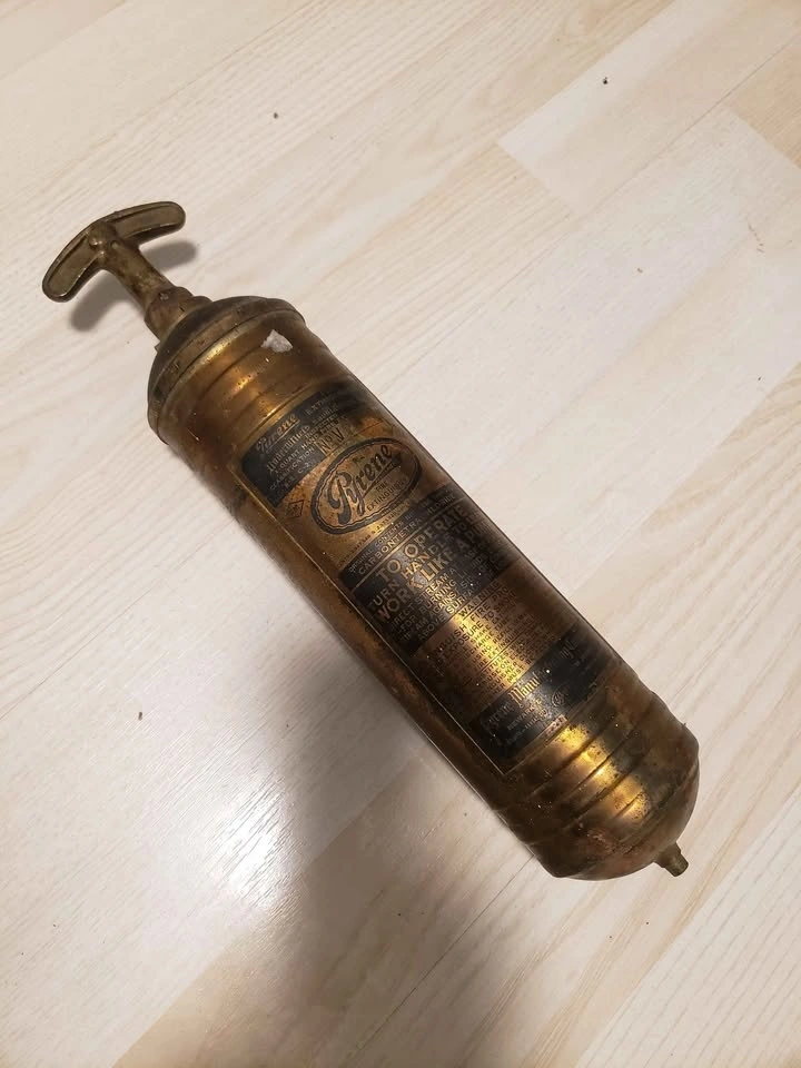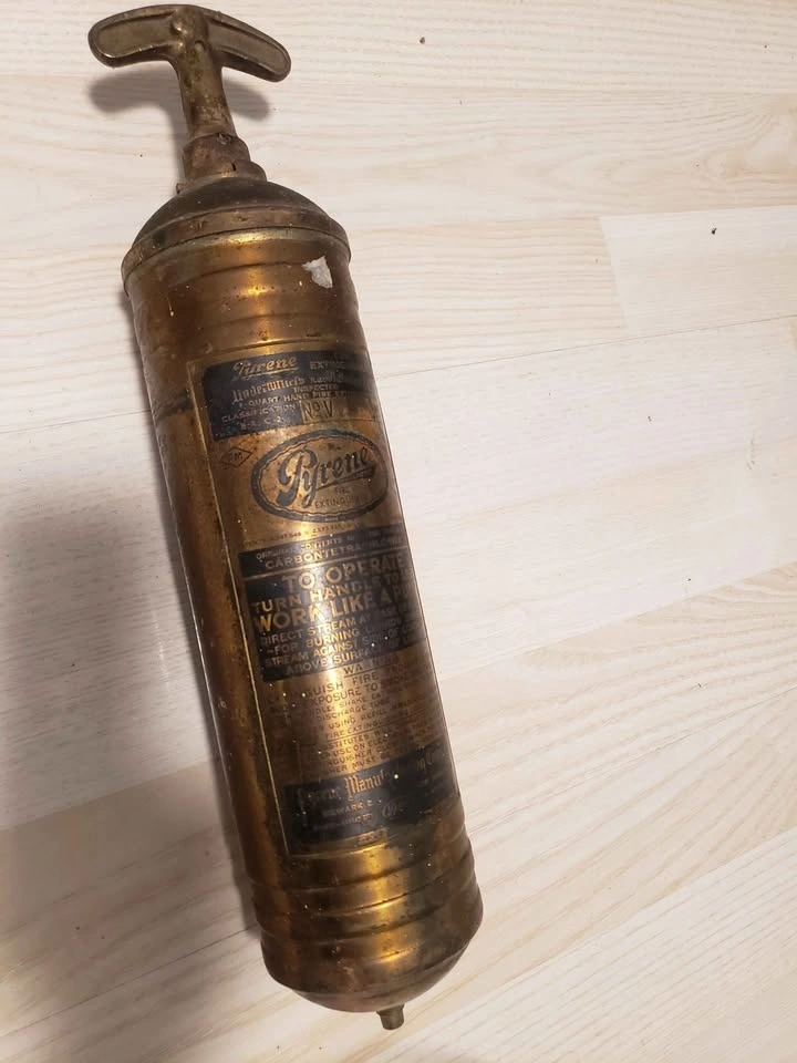 Buy & SellVintage Pyrene Brass Fire ExtinguisherVintage Pyrene Brass Fire Extinguisher$100Vintage Pyrene brass fire extinguisher. Is a cool antique piece, great for display. Has a pump handle on top. Nice collectible item.WHERE TO MEETCheck LocationView MapSELLERverifiedJaneBlenheim650 reviews0 chats·0 favorites·3 viewsSEND CHAT TO SELLERHi Jane! I’m interested in your listing.Hi Jane! I’m interested in your listing.Get the Karrot app to chatSign In to chat