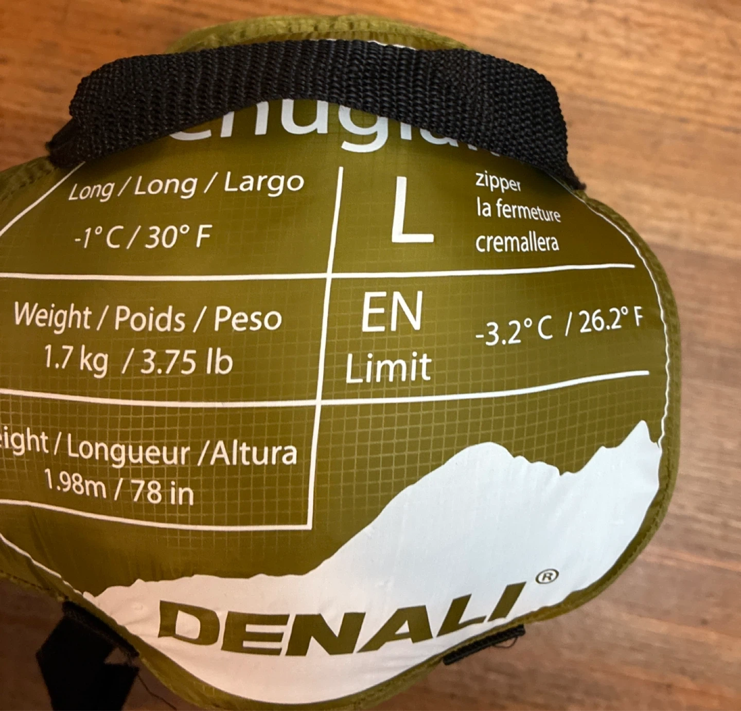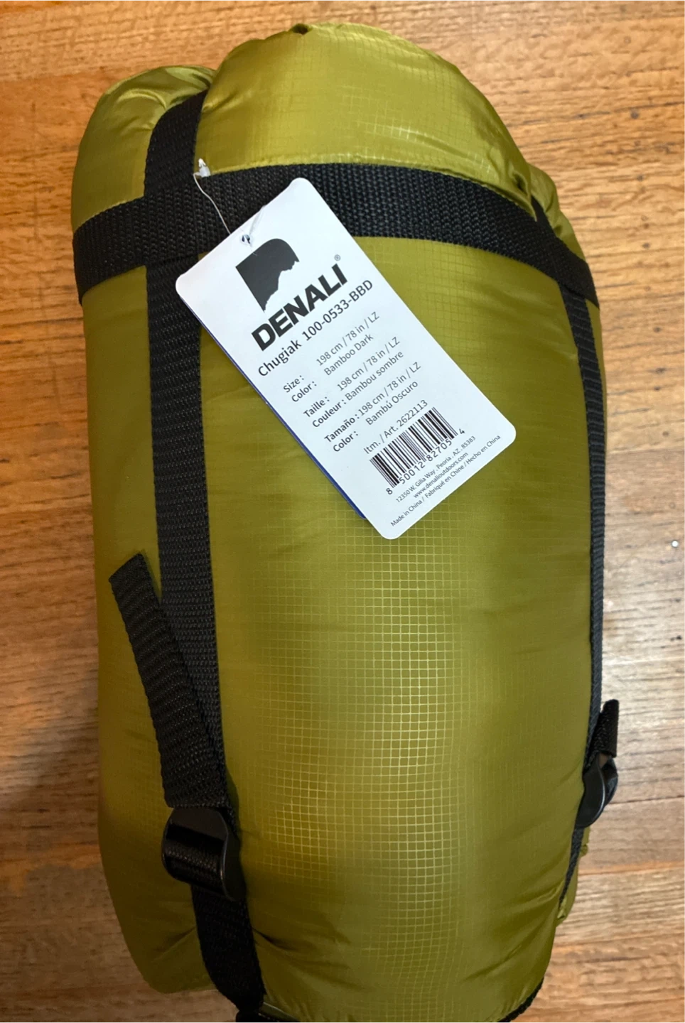 Denali Chugiak sleeping bag. It's a long size sleeping bag in Bamboo Dark colour. The temperature limit is -3.2°C / 26.2°F. It weighs 1.7 kg / 3.75 lb.