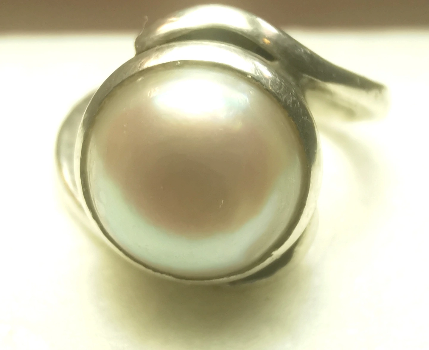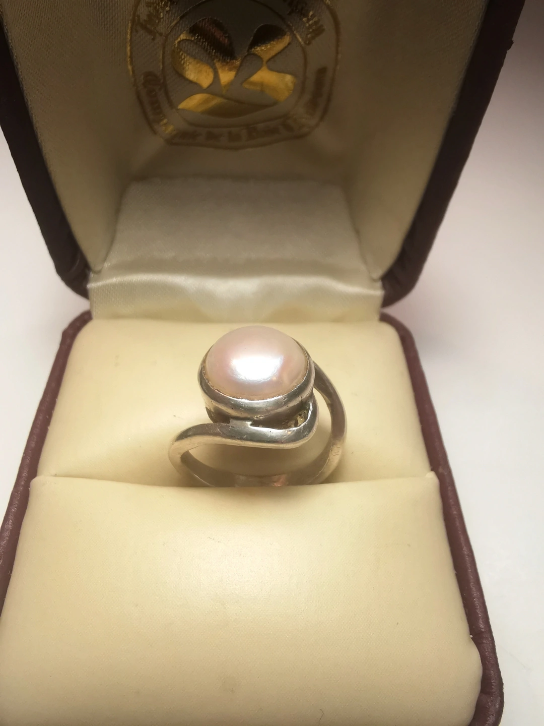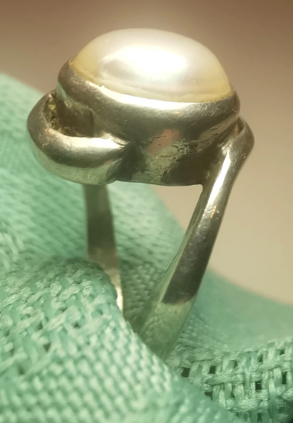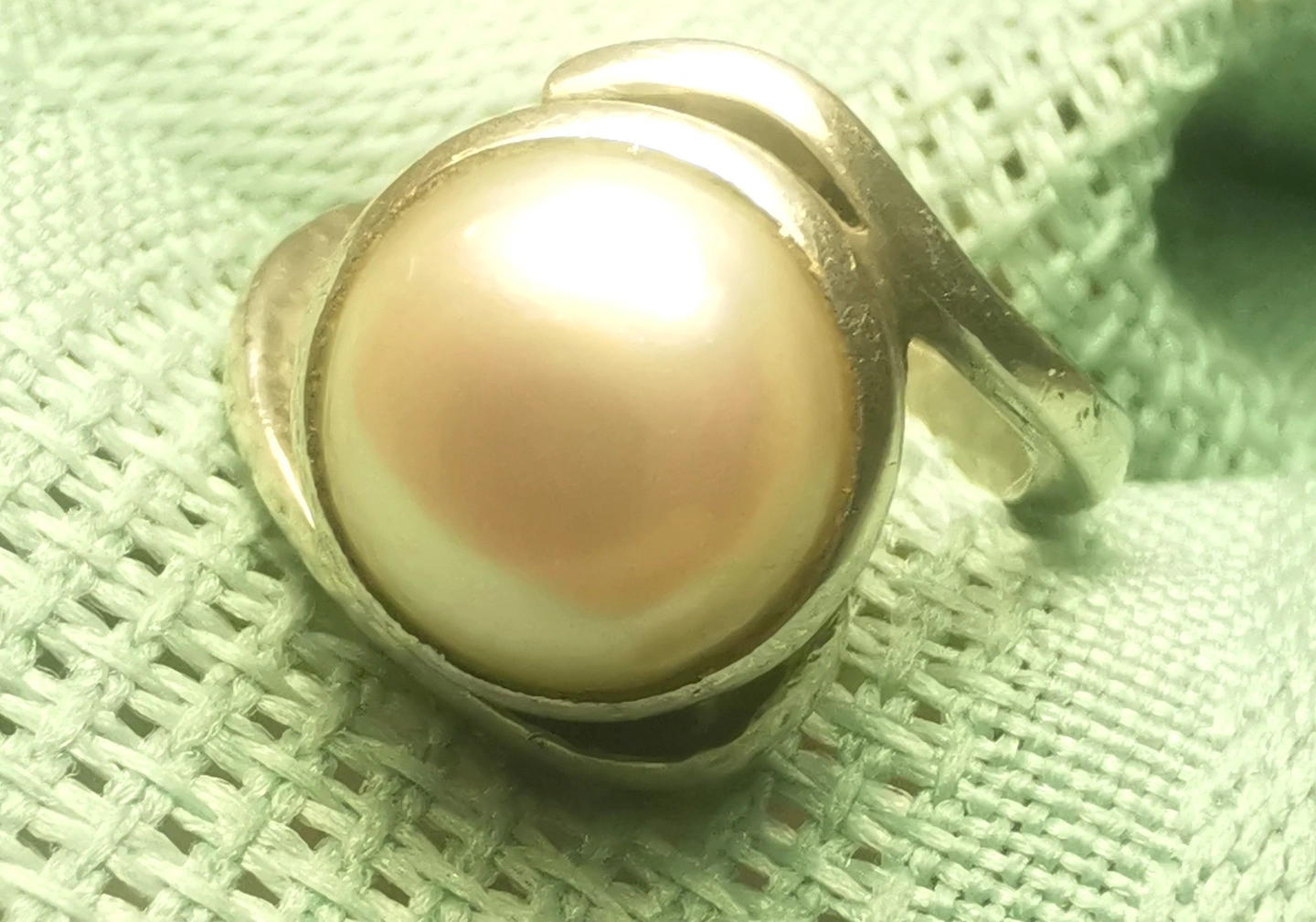 This is a striking vintage artisan ring featuring a large 10mm pearl (likely mabe or blister style) nestled in an organic, flowing bypass setting. The design is reminiscent of the modernist studio jewelry movement of the 1970s, offering a bold yet sophisticated look. Its petite size makes it an ideal choice for a pinky ring or for those with smaller frame sizes.