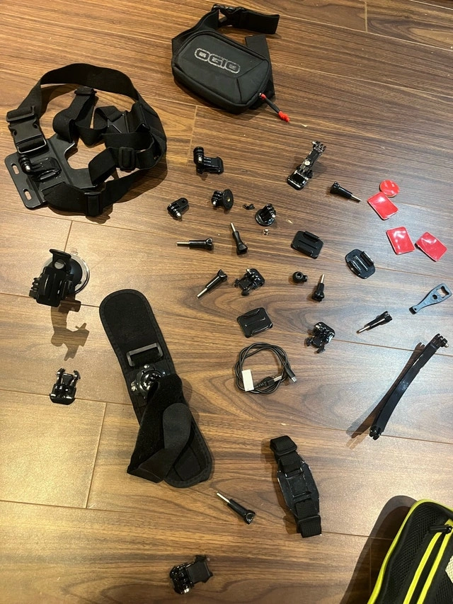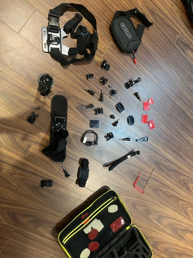 Brand new case of GoPro accessories and parts. Many different attachments that are all new and great quality. I bought it for my son but he broke his GoPro, so I need to sell these. Many professional 3M stickers as well. The small bag is a pouch for holding the GoPro, it’s $20.