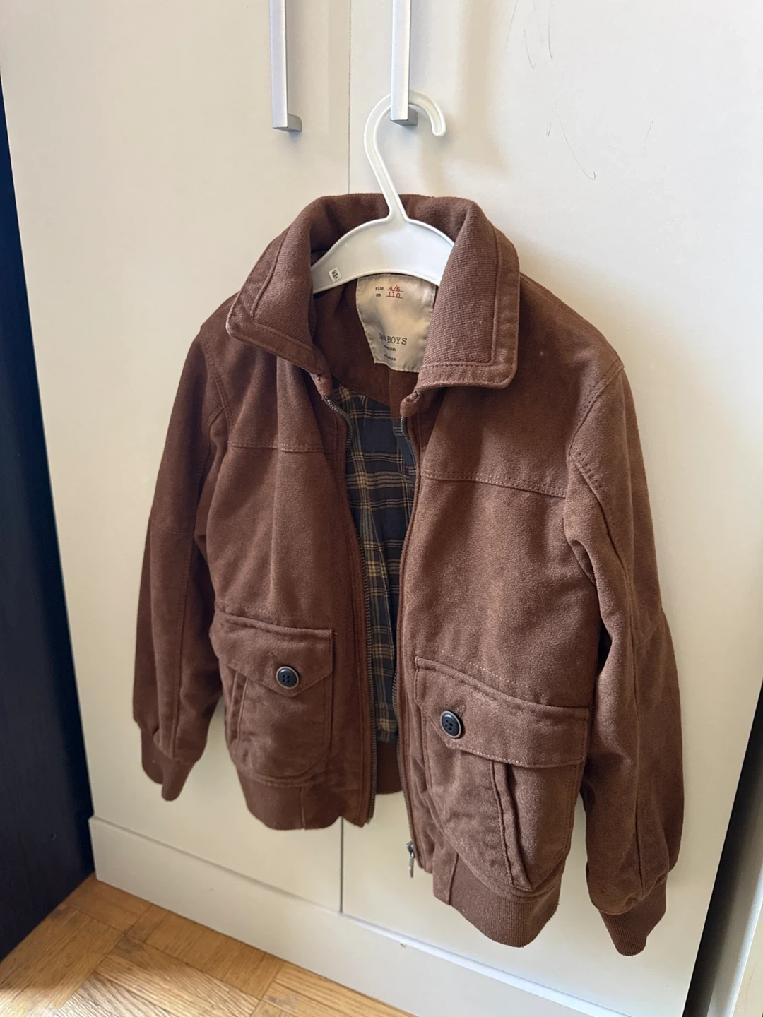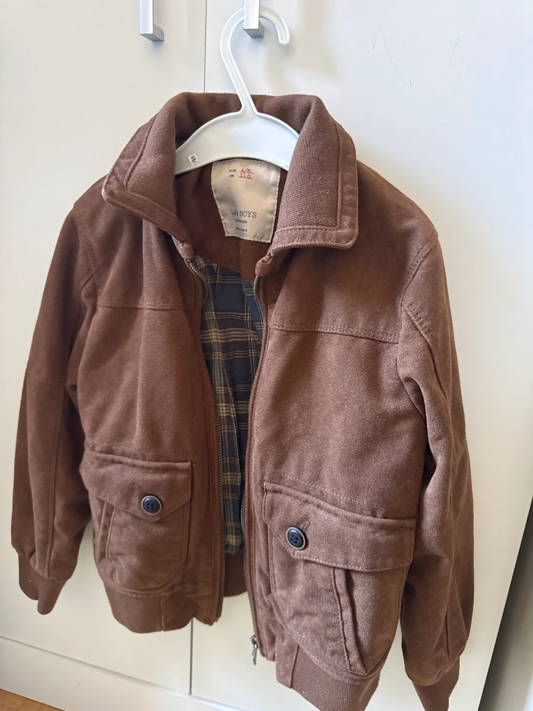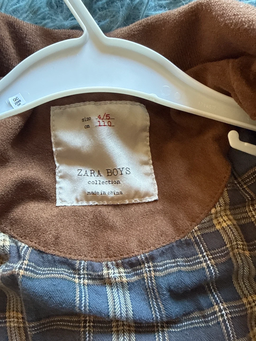 This is a ZARA BOYS Collection brown jacket. It's a size 4/5, corresponding to 110cm. The jacket features a plaid lining inside and two front pockets with button closures. It's great for keeping young ones warm!