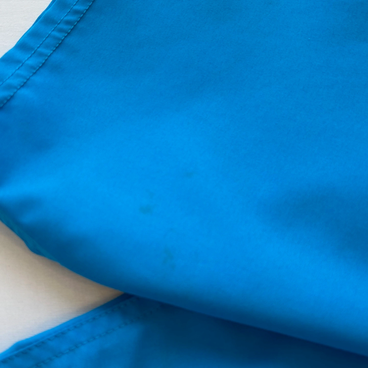 Flaws: Both pairs have small stains (pictured). Dusty blue pair it’s on the front near the hem. Bright blue pair have light staining on the inside back leg and back pocket. Otherwise both pairs are in great condition.